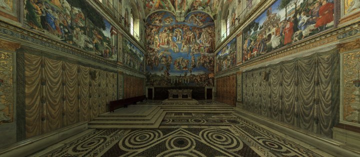 Buscando materiales sobre la capilla sixtina me he topado en el primer enlace de Wikipedia con otro enlace espectacular para poder ver la Capilla Sixtina ya recuperada, os lo presento. Haz click sobre la imagen inferior. Nota importante: Usa el ratón para moverte en la capilla, en la parte inferior izquierda tienes un Zoom con el que puedes acercarte o alejarte. Que lo gocen.