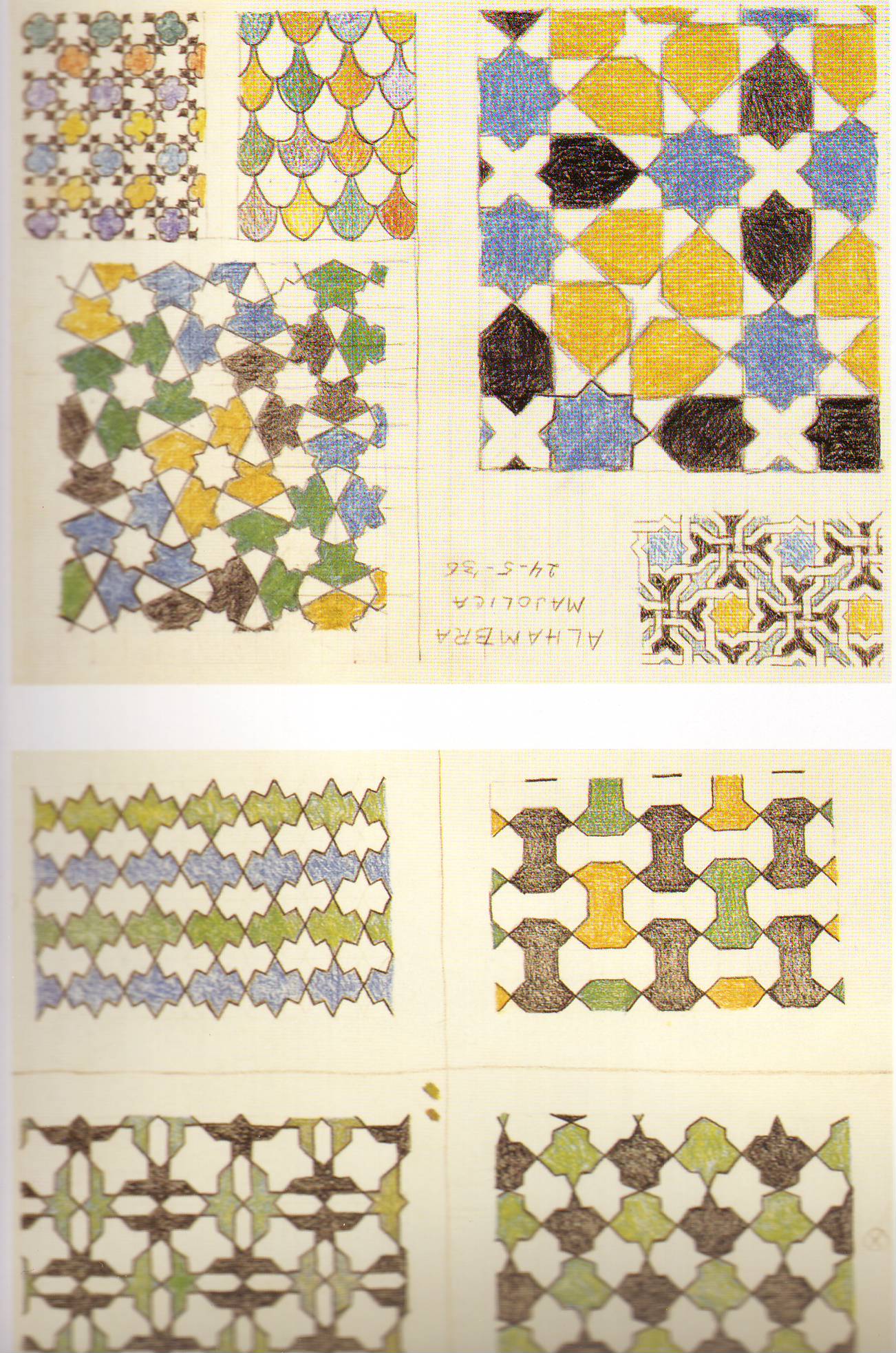 Después de visitar la Alhambra por primera vez, Escher intentó unos nuevos diseños, de los que se conservan bocetos de 1926, todavía muy rudimentarios. Tras una segunda visita, esta vez junto con su mujer, en 1936, copió durante varios días motivos allí representados y descubrió un sistema para representar particiones periódicas del plano, consiguiendo descubrir los 17 grupos de simetría planos que figuran en la Alhambra, a pesar de sus rudimentarios conocimientos matemáticos. Pero no se detuvo aquí, sino que además introdujo el color, cosa que nadie había hecho hasta esa fecha.