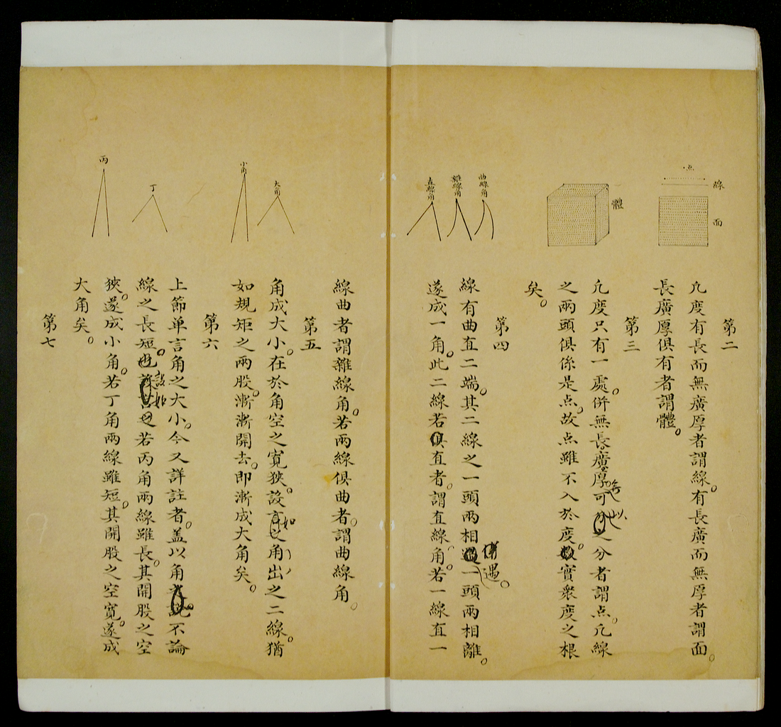 - Esta copia muy rara es manuscrita. Hay correcciones en tinta y numerosos trozos de papel con correcciones pegados en las páginas, y algunas notas editoriales que realizaron los traductores, de las cuales una dice: «Zhang Cheng desea corregir». La obra se presentó ante el emperador Kangxi, quien añadió comentarios propios en los márgenes superiores. La Biblioteca Nacional Central de Taiwán tiene otra edición de esta obra, cuyo prólogo indica que la obra de Ricci era poco clara gramaticalmente y difícil de entender, lo que explica el motivo de esta traducción. El texto de esta otra edición es el mismo que el que tradujeron Zhang Cheng y Bai Jin, excepto que incorpora las correcciones anteriores. Ambos ejemplares antes pertenecieron a los coleccionistas de libros Mo Tang (1865-1929) y Wang Yinjia (1892-1949).
