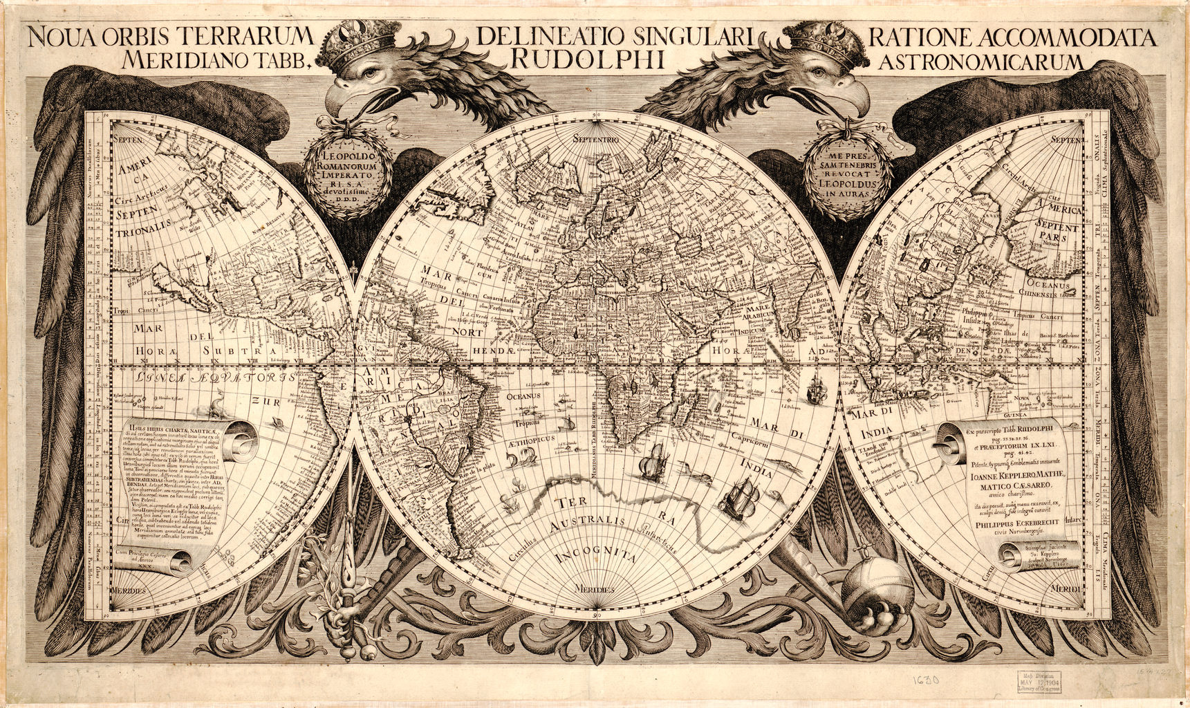 Aunque tiene fecha de 1630, esta «imagen moderna del mundo», de Philippus Eckebrecht parece ser una reimpresión posterior. Está dedicada a Leopoldo I, emperador del Sacro Imperio Romano, que llegó al trono en 1658. El mapa se creó originalmente a instancias del astrónomo Johannes Kepler (1571-1630) para reflejar su nuevo cálculo de longitud y latitud sobre la base de la observación planetaria. Las tablas astronómicas de Kepler, publicadas por primera vez en 1627, fueron mucho más precisas que cualquier tabla anterior. El diseño del mapa, enmarcado por el águila de dos cabezas del Sacro Imperio Romano, refleja la manera en que la ciencia del siglo XVII se utilizaba con fines políticos. El foco del hemisferio central es Europa, que se ubica sobre el cuerpo del águila, mientras que las alas del águila abarcan todo el globo terráqueo. El simbolismo imperial se utilizó en los mapas de la época de los Habsburgo y fue una alusión a las guerras en el oeste con Francia y en el este con el Imperio otomano. El meridiano central atraviesa la isla danesa que albergó el observatorio del mentor de Kepler, el astrónomo Tycho Brahe, del siglo XVI. Cuando Kepler sucedió a Brahe como matemático imperial en Praga bajo el reinado de Rodolfo II, se basó en los datos de Brahe para finalizar sus propios cálculos, conocidos como las Tablas Rudolfinas.