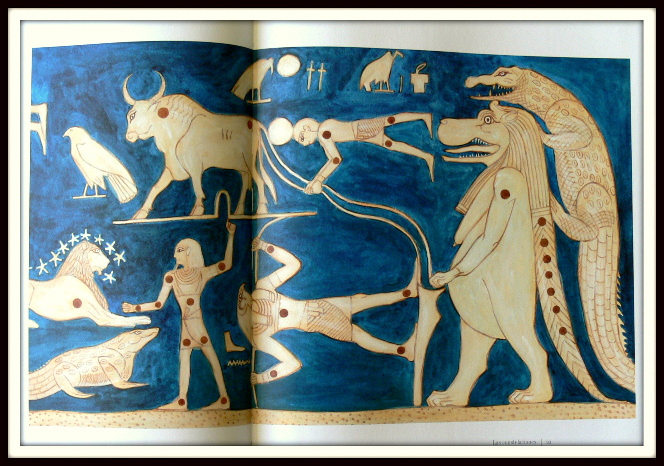 Los egipcios, grandes expertos en estrellas, capaces de orientar sus pirámides hacia el norte con un precisión de una décima de grado, no se preocupaban por el realismo en sus representaciones del cielo. Por ello resulta muy difícil identificar con certeza las constelaciones reproducidas en los frescos astronómicos que decoran algunas tumbas, como la del faraón Seti I (1294-1279 a.J.C.). Este grupo de constelaciones representaría a las circumpolares, llamadas por los egipcios “las que no mueren”, objeto de una especial veneración. La gran figura del Hipopótamo hembra con un cocodrilo sobre la espalda sería el equivalente del Dragón en el cielo griego. Está apoyado en un poste -¿el soporte del cielo?- unido a un toro con amplios cuernos que encarnaría a la osa mayor.