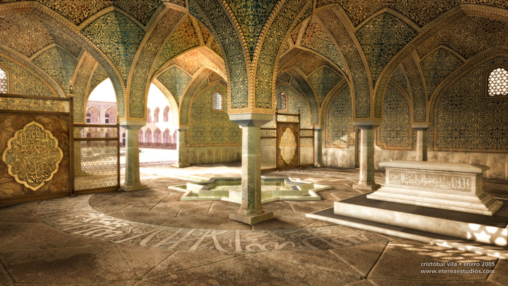 «…Este trabajo está inspirado en diferentes obras de la Arquitectura Persa. Se trata de una reproducción libre, ya que no he reproducido un único y conocido edificio. He tomado ideas y conceptos de distintas fuentes, especialmente de diferentes templos de la ciudad de Isfahan. La cúpula principal está basada en la estructura de la «Moder É Ahah» y las columnas y bóvedas están inspiradas en la «Mezquita del Imán», pero la ornamentación está inventada. Pido escusas a los especialistas en Arte Islámico en caso de haber cometido algún grave error de concepto.»