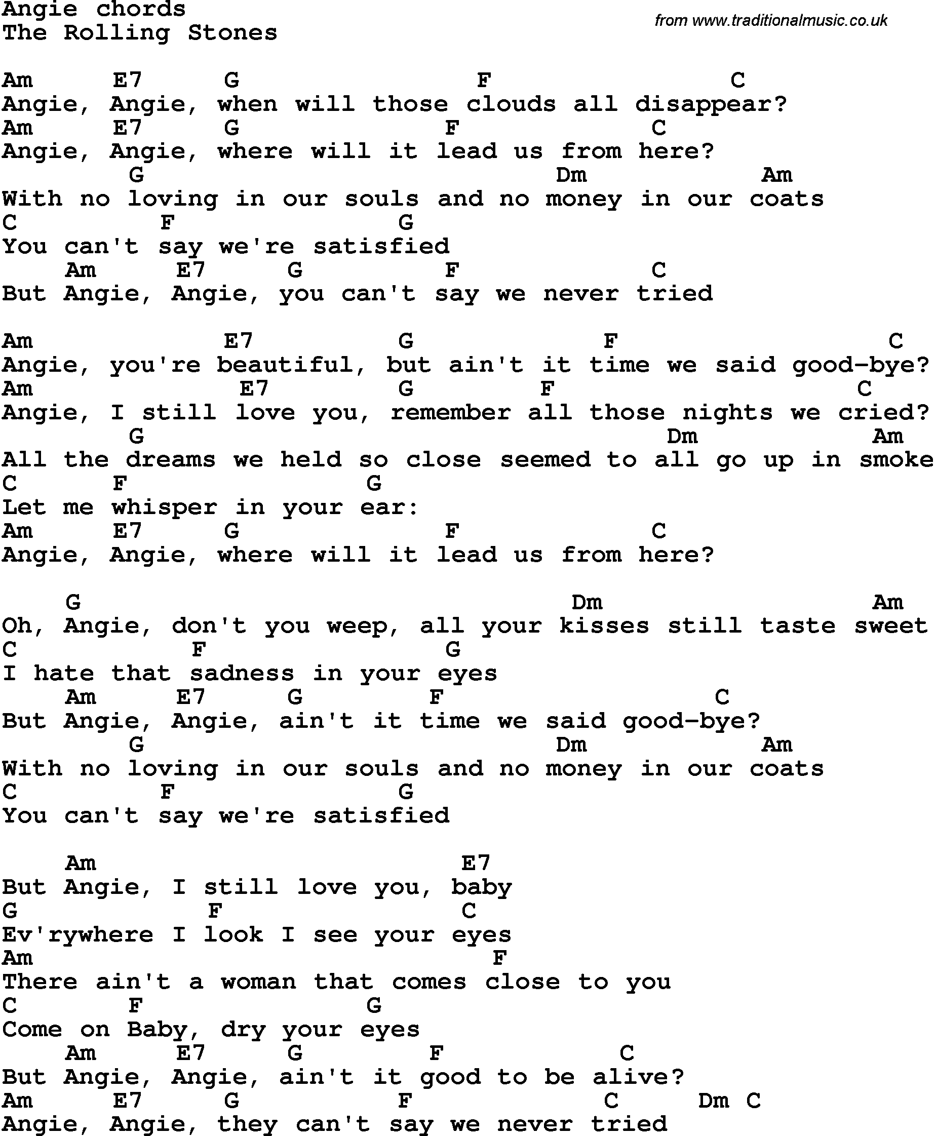 Hay muchas versiones acerca del origen de la canción, la más común es que este tema fue escrito por Jagger para la esposa de David Bowie, Angela, pero el mismo Jagger ha desmentido los rumores sobre este asunto. Richards afirma que el título y los acordes de la canción los tenía un año antes. Por lo mismo, «Angie» puede estar relacionado con la hija recién nacida de Richards de nombre Angela.