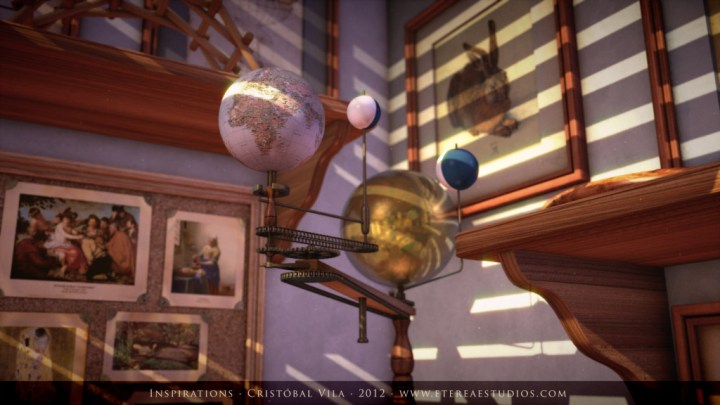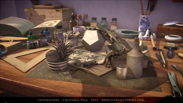 Pero me faltaba el motivo, los protagonistas de la acción. Así que volví a mirar hacia esa enorme e inagotable fuente de inspiración que es Escher y traté de imaginar cómo podría ser su lugar de trabajo, de qué cosas se rodearía un artista como él, tan profundamente interesado por la ciencia en general y las matemáticas en particular. Todo ello, eso sí, de una forma completamente imaginaria, libre e inventada.