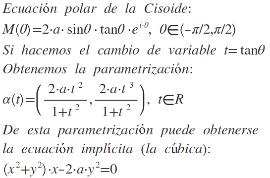 Las distintas ecuaciones, polar, paramétricas e implícita de la cisoide: