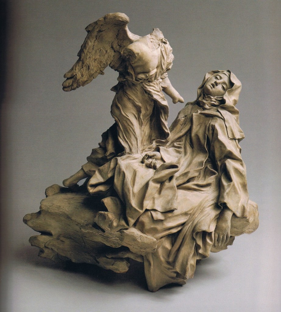 La temática religiosa está magníficamente conseguida en El éxtasis de Sta.Teresa en el que se advierten los rasgos de teatralidad, el naturalismo, la multiplicación de los pliegues de los ropajes, etc. típico del barroco.