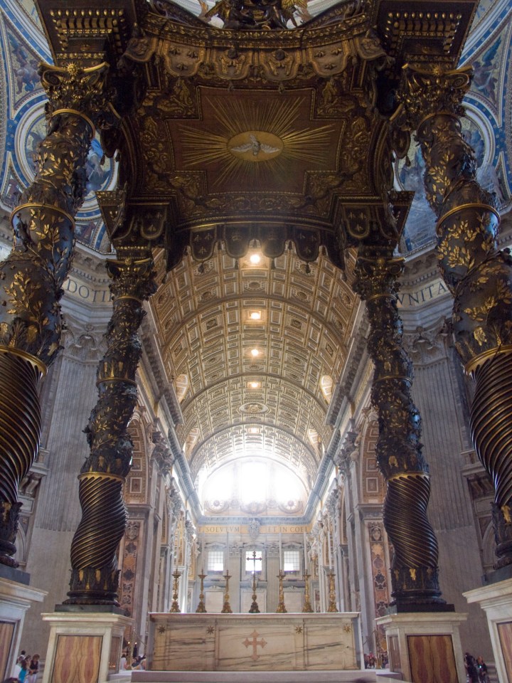 También, hablando del baldaquino, hay que destacar el papel de la otra figura coetánea a Bernini, el gran Borromini que tuvo un papel muy destacado en el diseño y que ha pasado desapercibido para la gran mayoría.