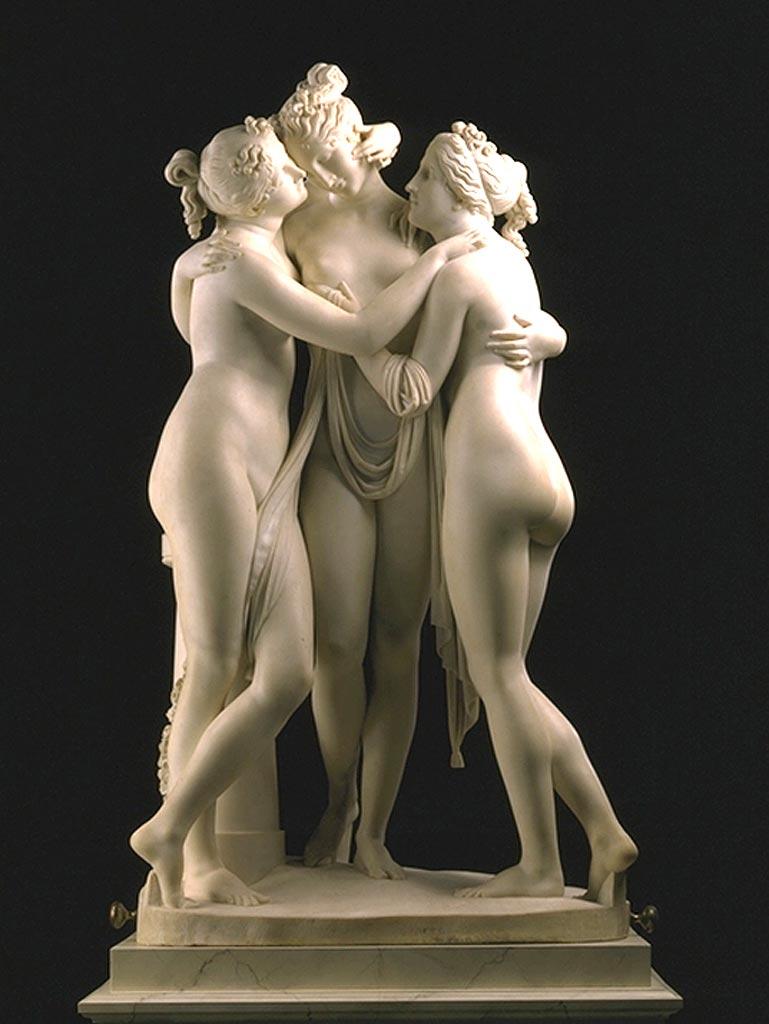 Las tres figuras de las mujeres se convierten en una por el abrazo, unido no sólo por sus manos, sino también por el velo que se enrosca en las tres. La unidad de las Gracias es uno de los temas principales de la obra. En la primera versión de la obra encargada por Josefina, las Gracias están de pie en un altar de sacrificios adornado con tres coronas de flores y guirnaldas simbolizando sus vínculos frágiles y cercanos.