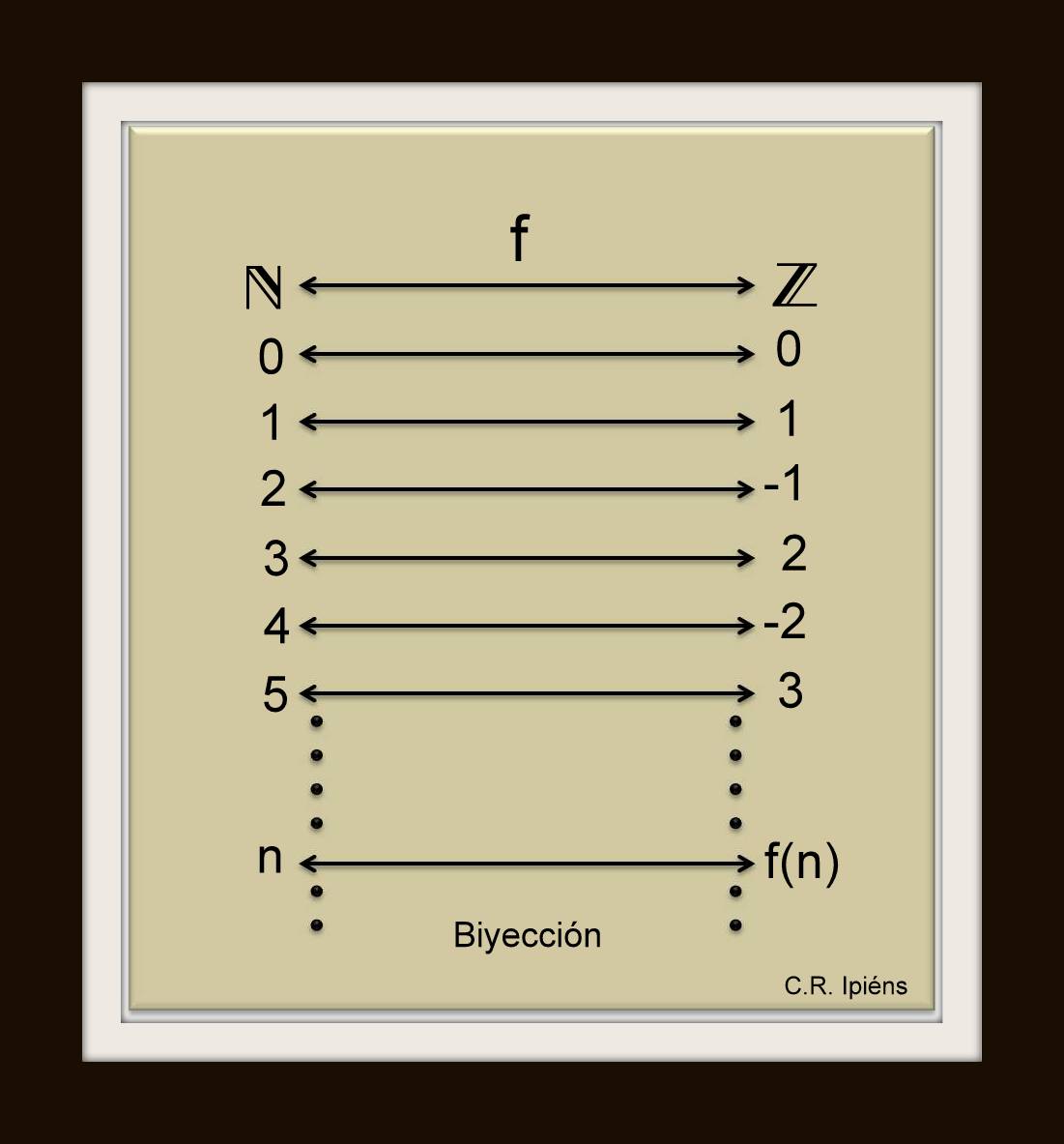 Para probarlo y según lo dicho anteriormente, bastaría encontrar una biyección que pusiera en relación a N con Z para poder asegurar que Z es otro conjunto infinito numerable, es decir con el mismo cardinal que N: aleph sub cero.