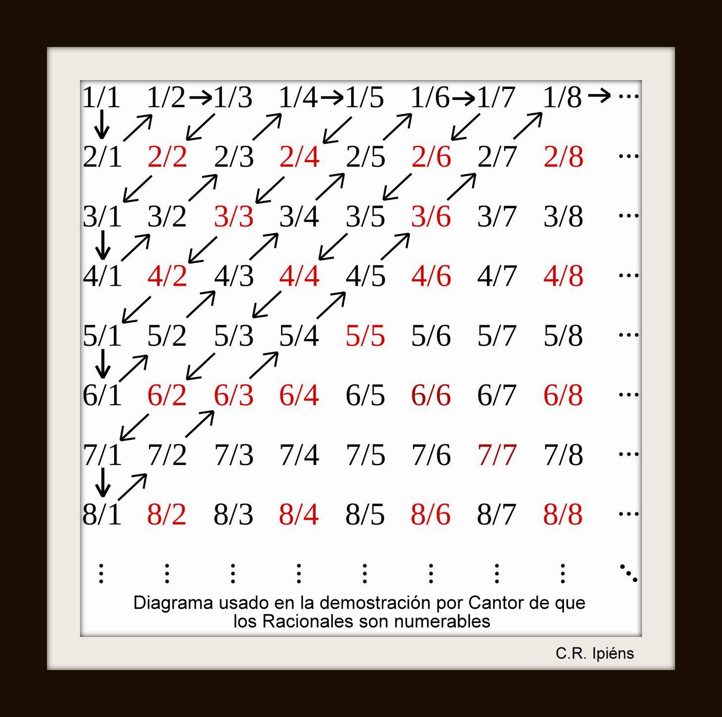 Comenzamos colocando todos los números racionales en una tabla, y aprovechando que una fracción no es más que una pareja de enteros que ocupan su numerador y su denominador respectivamente, los dispone del siguiente modo: cada fila tiene un mismo número natural en el numerador, y cada columna un mismo número en el denominador: