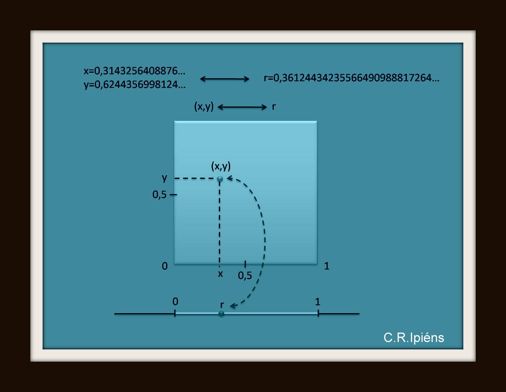 Para ello, en un derroche de elegancia propone el siguiente emparejamiento (biyección de nuevo) entre los puntos del segmento [0,1] y los del cuadrado que tiene por lado la misma longitud que el segmento, esto es: 1.