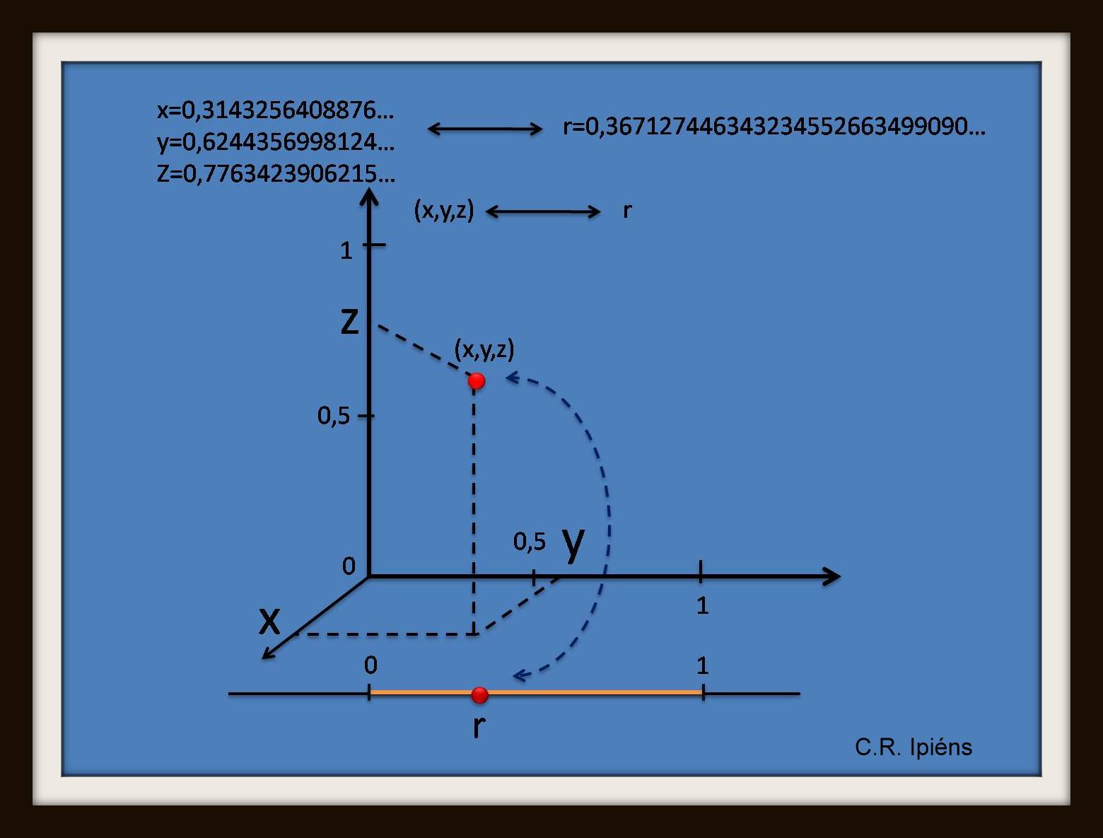 El nuevo número “r”, se obtiene de nuevo alternando los decimales ahora de x, y, z así, su primera cifra decimal será la primera cifra decimal de x, su segunda cifra decimal será la primera cifra decimal de y, la tercera cifra decimal será la primera de z, la cuarta la segunda de x, la quinta la segunda de y, la sexta la segunda de z,…y de nuevo “así sucesivamente”.
