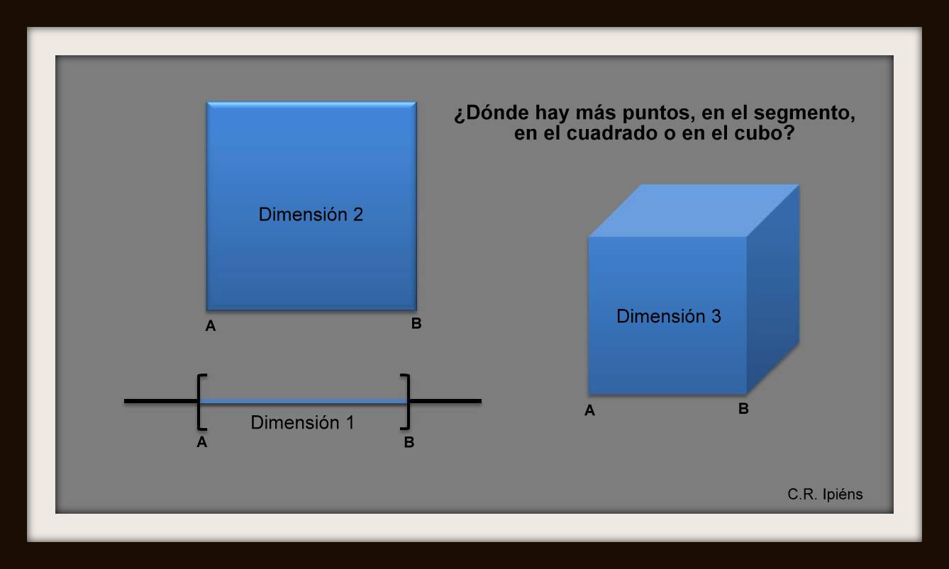 ¡Sorprendentemente, aunque se amplíe el conjunto de puntos de un segmento al de los puntos de un cuadrado o un cubo, no hay más puntos en el cubo ni en el cuadrado que en el segmento, por más raro que esto resulte no incrementamos realmente el número de objetos con los que trabajamos!