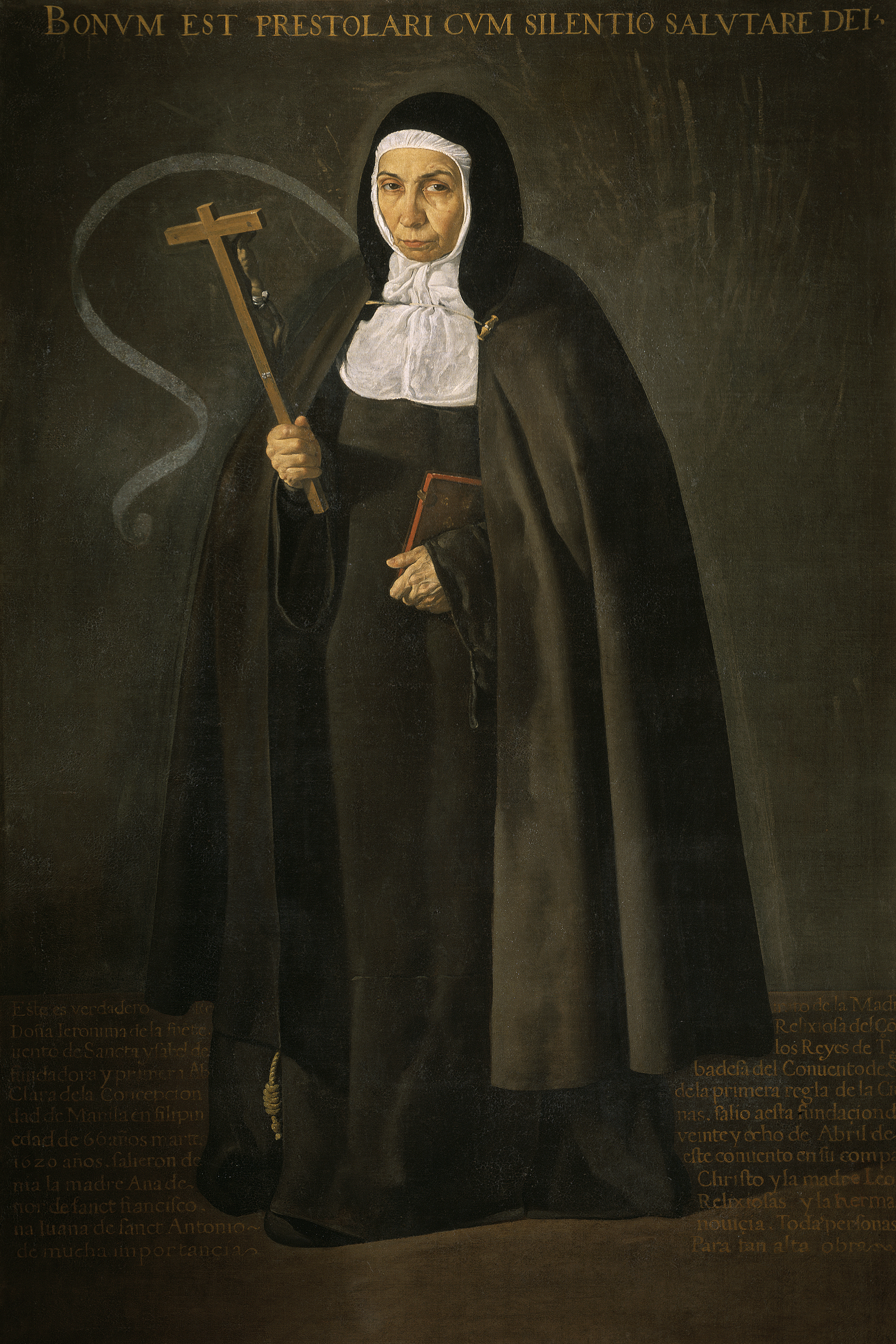 De carácter resuelto y enérgico, la madre Jerónima nace en Toledo en un medio familiar acomodado e ingresa a los quince años en las Clarisas locales. Su fama acaba llegando a la corte, donde es consultada por la reina Margarita de Austria. Tras este retrato, realizado cuando tenía 65 años para el Convento de Santa Isabel de los Reyes en Toledo, se embarca en Sevilla hacia Manila. En dicha ciudad funda el primer convento de religiosas y muere en 1630.