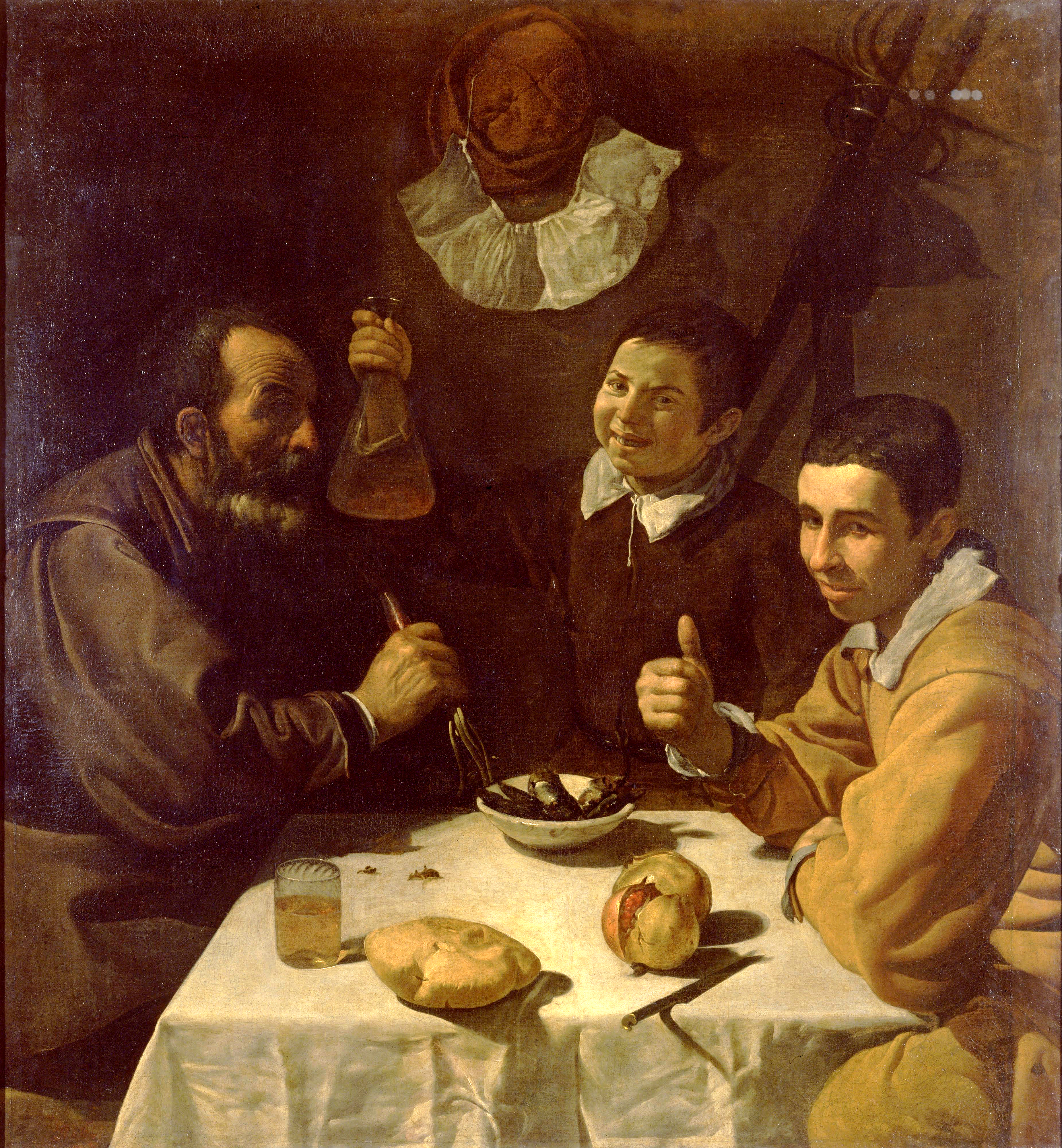 Un hombre de edad avanzada –cuya pobre ropa, al igual que su perfil anguloso, parecen quedar ennoblecidos por la luz incidente- está dando a un chiquillo un vaso de agua, que adquirirá más frescura al añadirle un higo (ver detalle). El énfasis con el que las dos jarras acaparan el primer plano, brillando a la luz; el resplandor de las gotas de agua sobre la pared de la vasija de mayor tamaño y la preciosa transparencia de la copa, todo esto se corresponde con la cualidad corporal e intelectual de los tres personajes. Pero, por muy digna que resulte la composición, el observador coetáneo no podría pasar por alto un momento burlesco: el cuadro de Velázquez recuerda una escena de novela picaresca, un género literario muy popular en el siglo XVII, que –como las novelas ejemplares de Cervantes- era un fiel reflejo de la sociedad española de la época.