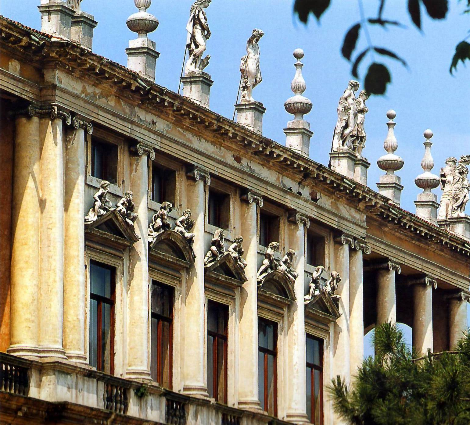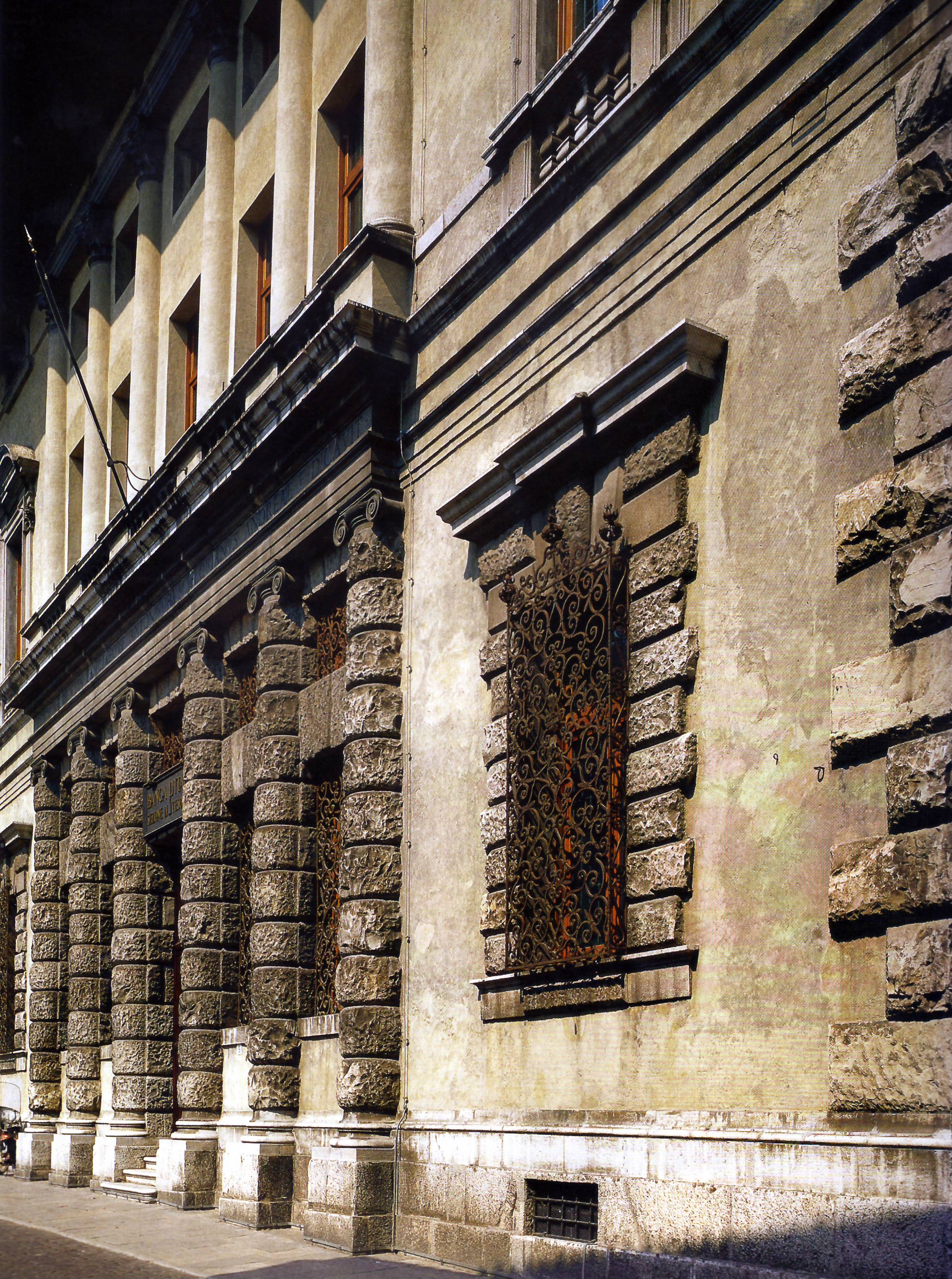 Palladio emplea aquí por primera vez el orden colosal de pilastras en uno de sus palacios urbanos. La pared se escalona con diferentes planos de profundidad. Palladio se adapta a la línea de la calle; en los ejes exteriores abandona el orden colosal, las pilastras son sustituidas por atlantes en el piano nobile.