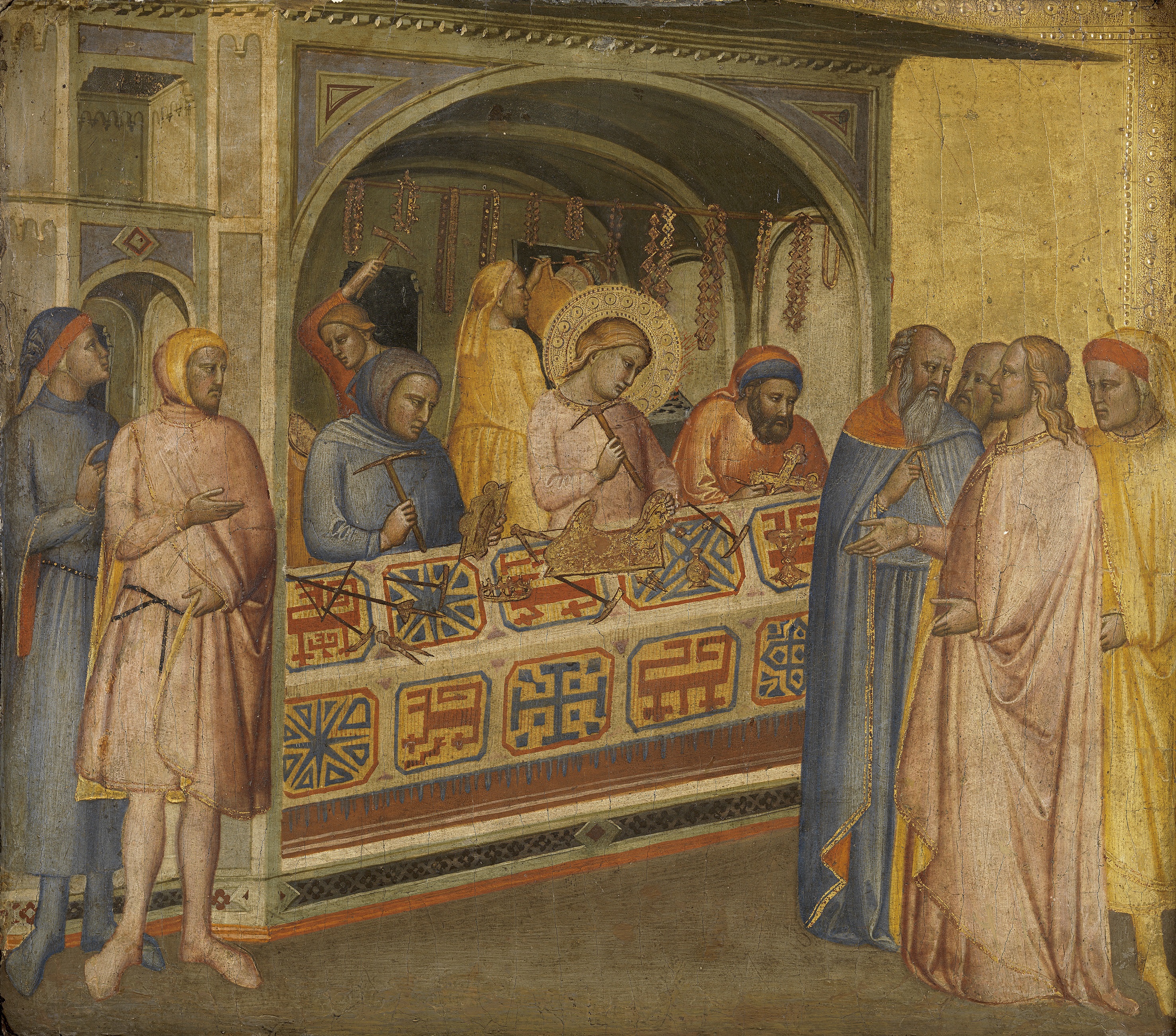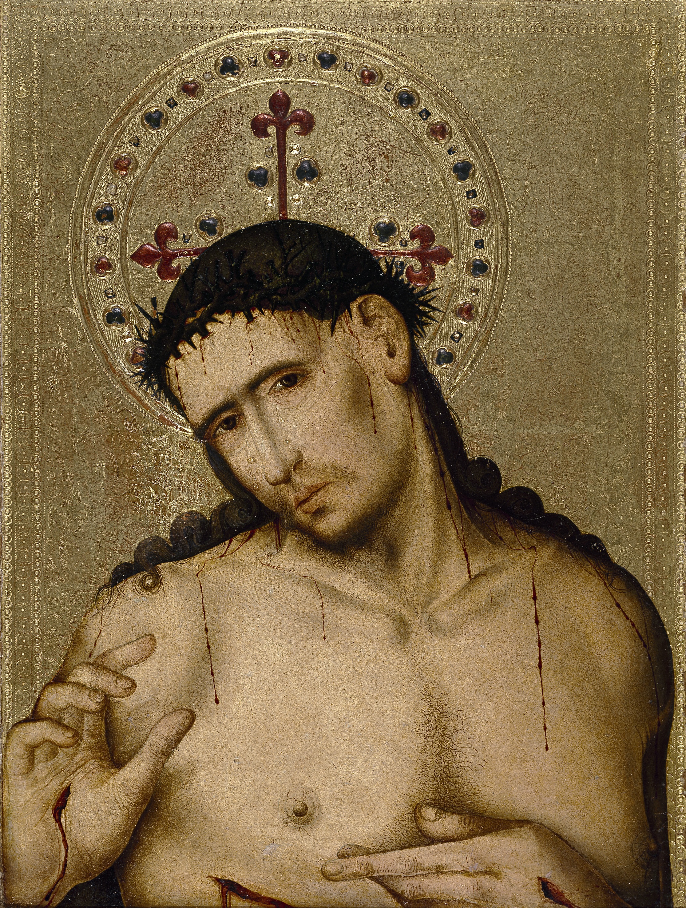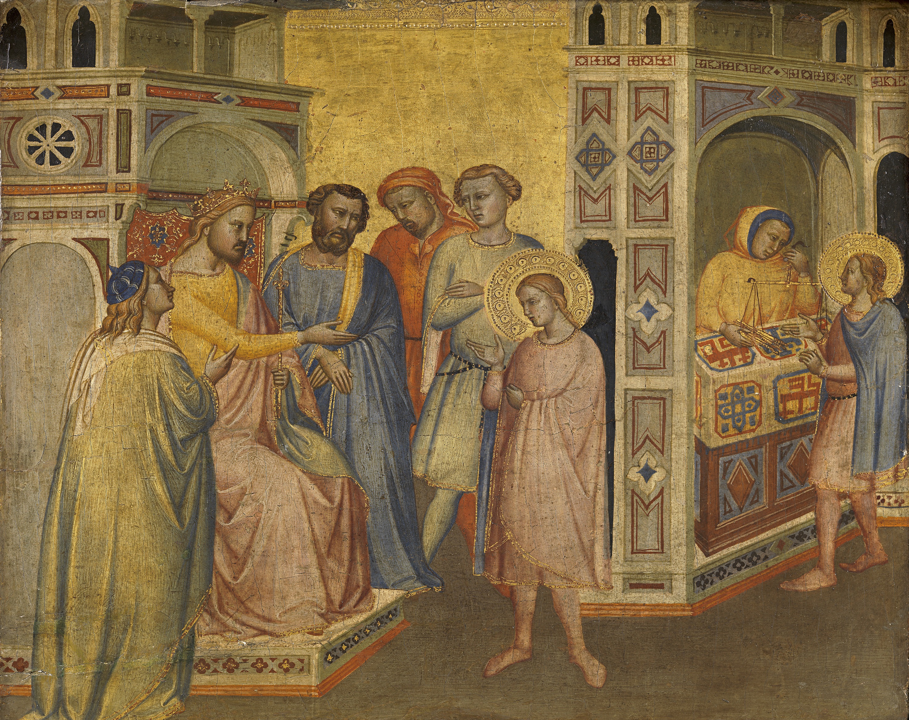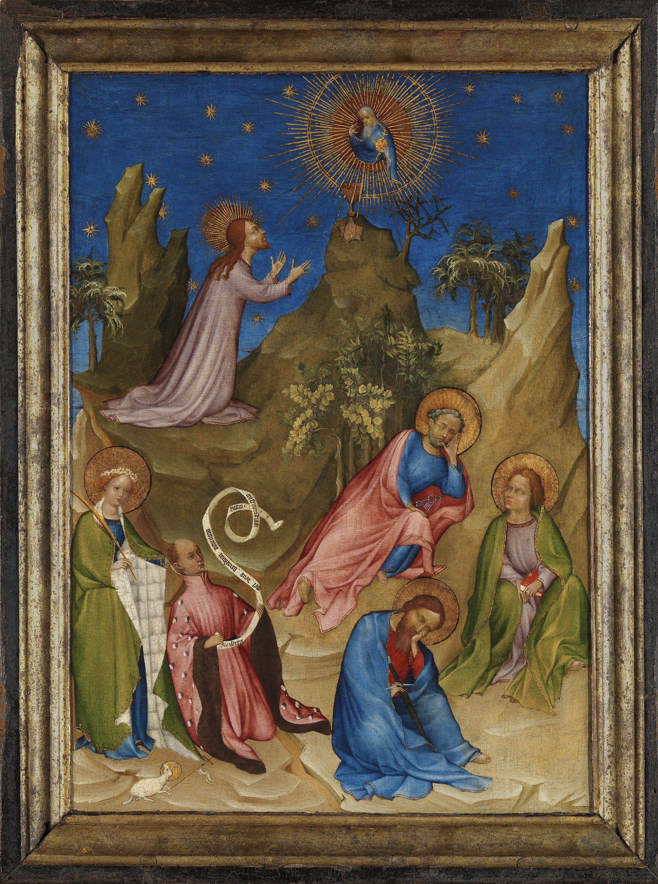 Una cruz de cristal de roca, cobre y marfil del siglo XIV abre el brillante camino del arte en pequeño formato. Los primeros ejemplos residen en escenas de predelas con vidas de santos y de la Virgen, como las de San Eloy el Maestro de la Madonna della Misericordia, o las de la moderna Anunciación de Fra Angelico, con su perspectiva euclidiana. La pintura de devoción se presenta en pequeños cuadros, en ocasiones con la función de altares portátiles que incluían al donante, como la tabla francesa de principios del siglo XV, donde Luis I de Orleans ora ante una oración en el huerto con su temprano y minucioso paisaje, o los Desposorios de la Virgen del Maestro de la Leyenda de Santa Catalina, que introduce a un caballero en el fondo de una calle cualquiera en una ciudad nórdica.
