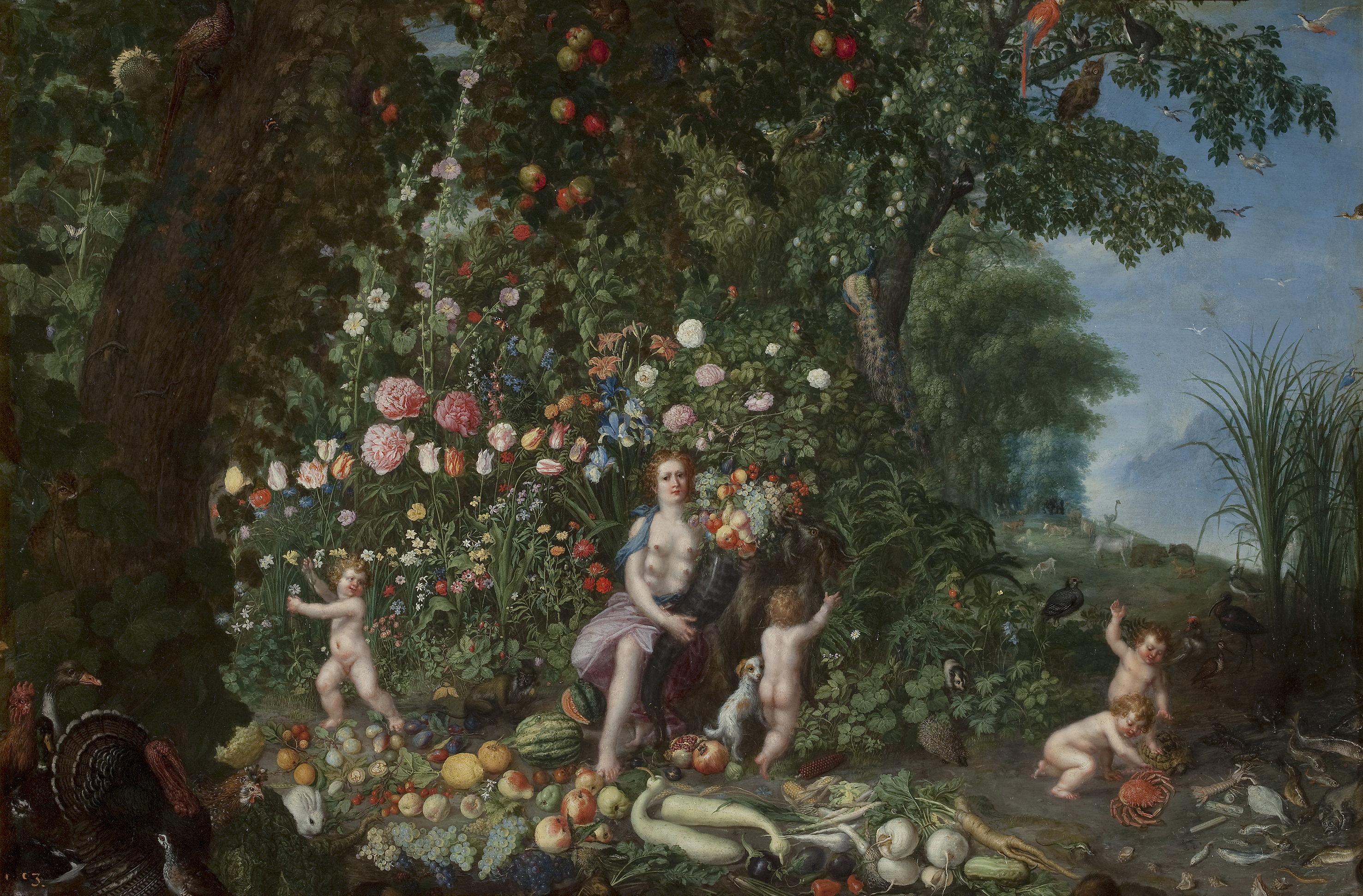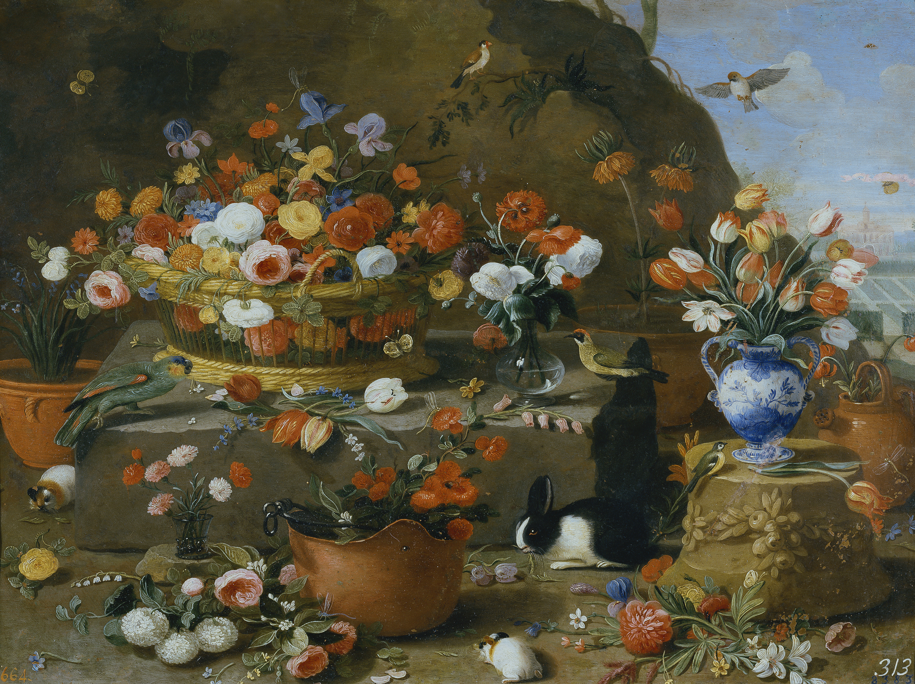 Ante la mirada del melancólico Filósofo de Koninck se despliegan bodegones y floreros que evidencian el concepto de vanitas que subyace en el arte del siglo XVII: el paso del tiempo, la vanidad de la belleza y de las cosas y la presencia de la muerte. Un pequeño retrato de Mariana de Austria, según las facciones que de ella dejó Velázquez, nos recuerda que entre los atributos de las reinas estaban las fl ores, por su belleza y delicado aroma. Brueghel el Joven anuncia las posibilidades del mundo en su alegoría de la Abundancia, que promete los bienes que todo ser humano espera encontrar en su fugaz paso por la tierra y a los que aluden con ligereza las exquisitas frutas de Van der Hamen. Los pintores flamencos continúan la deslumbradora locura de sus predecesores medievales por captar la realidad. Su magia reside en su capacidad de abstracción, en evitar la pedantería del pormenor y en cambio recurrir a la intensidad selectiva para revivir la materia y conseguir, como Van Vollenhoven en el estornino de su bodegón, que el pájaro sea pájaro y no su imagen pintada, como en las hazañas pictóricas de Parrasios y Zeuxis. La solemne arquitectura que acoge al grupo de pajarillos muertos, con una resonancia de catacumba, no es menos impresionante que el oscuro vacío que rodea al cordero de Zurbarán o al gallo blanco de Metsu. El francés Linard expresa la vanidad del saber y Steenwijck la rapidez con la que se desvanecen los placeres. Sólo queda el recurso de la huida, para la que Brueghel el Joven nos proporciona al bello y fuerte caballo blanco con el que cabalgar por su Paraíso.