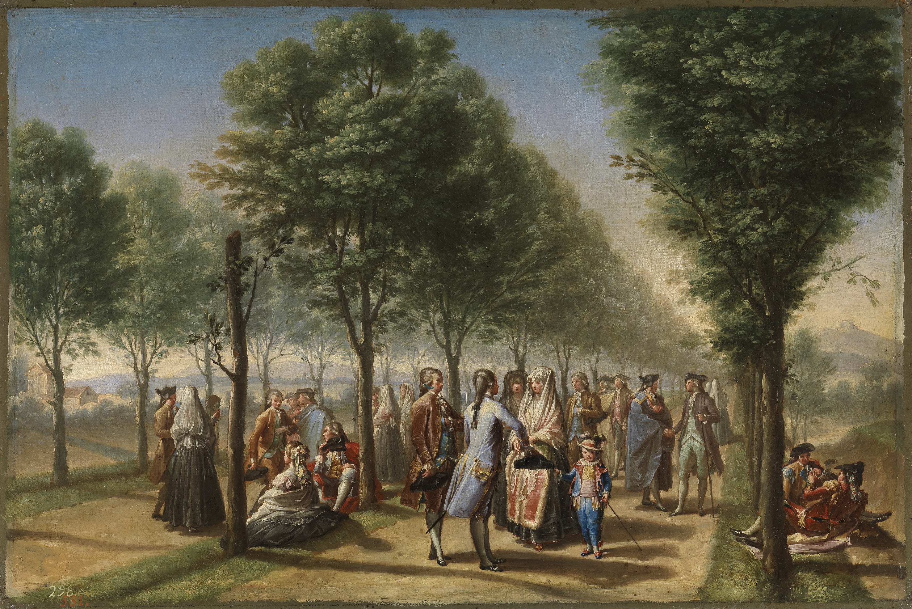 El arte de la segunda mitad del siglo XVIII evidencia el patrocinio de los monarcas de la casa de Borbón y la moderna formación proporcionada por las academias de Bellas Artes. Junto a la monumental pintura al fresco, que Vicente López continuó en el siglo XIX, los monarcas ilustrados favorecieron los temas populares como decoración de los Sitios Reales de recreo. Majos y majas retrataron por primera vez a una clase social en ascenso, personas de oficios diversos que incluían ya a la mujer, independiente y liberal, así como a la incipiente burguesía, elegante y curiosa, que llenaba paseos y fi estas populares y entre la que se mezclaba, como un juego, la aristocracia. Giandomenico Tiepolo, que ya había abordado este tipo de escenas en Italia, lo hace aquí con un trasfondo crítico que anuncia a Goya. Los bocetos de Bayeu y Castillo muestran la faceta agradable del pueblo, la vida en la calle que preludia temas modernos del siglo siguiente. El retrato burgués está representado en el de Feliciana Bayeu, o, ya a principios del XIX, en la expresiva imagen de la mujer del pintor Rafael Tegeo. Otras escenas, como la atribuida a Juliá, Escena de una comedia, o la Mujer sentada de Camarón, así como los Tres viajeros aéreos favoritos, de Rigaud, reflejan aspectos curiosos de fines del siglo XVIII. El último muestra el ascenso en globo que tuvo lugar en 1784 en Londres, ante una muchedumbre de 200.000 personas, del joven Vincent Lunardi, su ayudante George Biggin y la actriz y modelo Letitia Anne Sage, la primera mujer en subirse a un globo aerostático, acontecimiento que motivó numerosas historietas escabrosas sobre lo que los protagonistas habían hecho por encima de las nubes.
