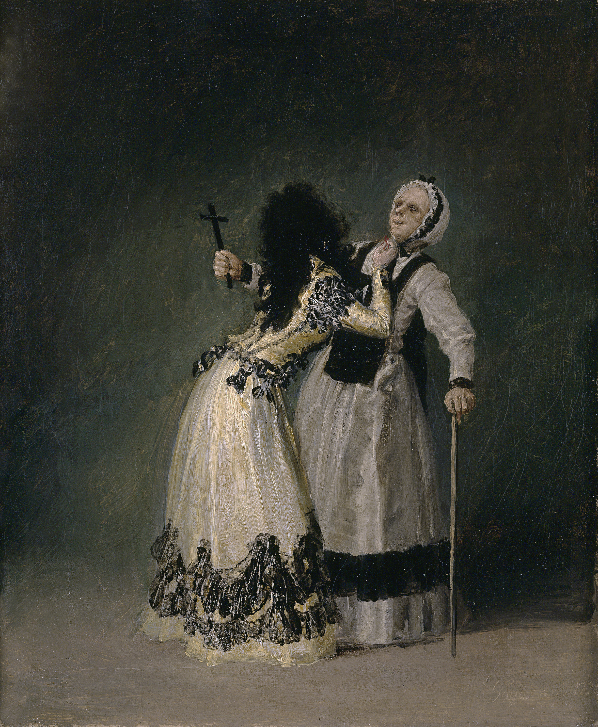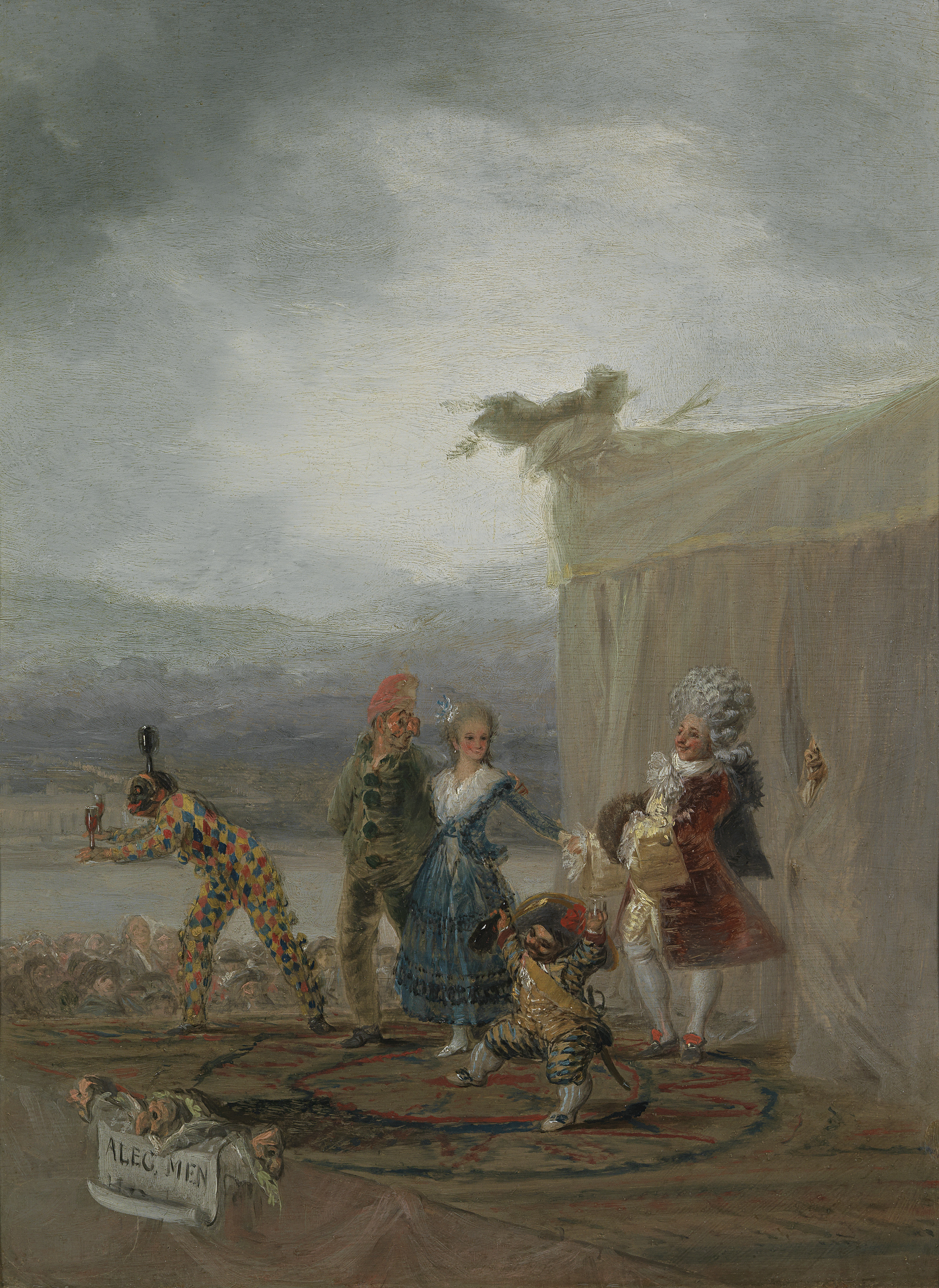 Maqueta en madera del edificio del Museo Nacional del Prado, Anónimo. Madera de limoncillo, boj, caoba, nogal y pino, 66 x 362 x 94 cm, H. 1787. Modelo que reproduce, en líneas generales, el tercer “pensamiento” de Juan de Villanueva para el edificio.Retrato de Goya, Gaetano Merchi. Bronce, 46 x 25 x 22 cm, H. 1795. Réplica del original, conservado en la Real Academia de Bellas Artes de San Fernando, Madrid.Autorretrato, Francisco de Goya y Lucientes. Óleo sobre lienzo, 18,2 x 12,2 cm, 1796 – 1797. Pequeño retrato.Manuela Goicoechea y Galarza, Francisco de Goya y Lucientes. Óleo sobre lámina de cobre, 81 mm de diámetro, 1805. Pequeño retrato.Juana Galarza de Goicoechea, Francisco de Goya y Lucientes. Óleo sobre lámina de cobre, 81 mm de diámetro, 1805. Pequeño retrato.La duquesa de Alba y su dueña, Francisco de Goya y Lucientes. Óleo sobre lienzo, 33 x 27,7 cm, 1795. Cuadro de gabinete.El albañil herido, Francisco de Goya y Lucientes. Óleo sobre lienzo, 268 x 110 cm, 1786 – 1787. Cartón para la serie de tapices destinados a decorar el comedor o Sala de Conversación en el palacio del Pardo.El albañil borracho, Francisco de Goya y Lucientes. Óleo sobre lienzo, 35 x 15 cm, 1786. Boceto para uno de los cartones para la serie de tapices destinados a decorar el comedor o Sala de Conversación en el Palacio del Pardo.El Prendimiento de Cristo, Francisco de Goya y Lucientes. Óleo sobre lienzo, 40,2 x 23,1 cm, 1798. Boceto para el cuadro de mayor tamaño destinado a la sacristía de la catedral de Toledo.Santa Justa y santa Rufina, Francisco de Goya y Lucientes. Óleo sobre tabla, 45 x 29 cm, 1817. Boceto para el cuadro de mayor tamaño destinado a la sacristía de los Cálices de la catedral de Sevilla.Vuelo de brujas, Francisco de Goya y Lucientes. Óleo sobre lienzo, 43,5 x 30,5 cm,1797 – 1798. Cuadro de gabinete.Un garrochista, Francisco de Goya y Lucientes. Óleo sobre lienzo, 57 x 47 cm, 1791 – 1792. Cuadro de gabinete. Pintado encima de un boceto para un retrato ecuestre de Manuel Godoy.La Sagrada Familia, Francisco de Goya y Lucientes. Óleo sobre lienzo, 63,5 x 51,5 cm, H. 1787. Cuadro de devoción.Tobías y el ángel, Francisco de Goya y Lucientes. Óleo sobre lienzo, 63,5 x 51,5 cm, H. 1787. Cuadro de devoción.La pradera de San Isidro, Francisco de Goya y Lucientes. Óleo sobre lienzo, 41,9 x 90,8 cm, 1788. Boceto para alguno de los cartones para la serie de tapices destinados a decorar el Dormitorio de las Infantas en el palacio del Pardo.La gallina ciega, Francisco de Goya y Lucientes. Óleo sobre lienzo, 41 x 44 cm, 1787. Boceto para alguno de los cartones para la serie de tapices destinados a decorar el Dormitorio de las Infantas en el palacio del Pardo.La ermita de San Isidro el día de la fiesta, Francisco de Goya y Lucientes. Óleo sobre lienzo, 41,8 x 43,8 cm, 1788. Boceto para alguno de los cartones para la serie de tapices destinados a decorar el Dormitorio de las Infantas en el palacio del Pardo.La riña en el Mesón del Gallo, Francisco de Goya y Lucientes. Óleo sobre lienzo, 41,9 x 67,3 cm, 1777. Boceto para uno de los cartones para la serie de tapices destinados a decorar el comedor de los príncipes de Asturias en el palacio del Pardo.Los cómicos ambulantes, Francisco de Goya y Lucientes. Óleo sobre lámina de hojalata, 42,5 x 31,7 cm, 1793 – 1794. Cuadro de gabinete.Los cómicos ambulantes, Francisco de Goya y Lucientes. Óleo sobre lámina de hojalata, 42,5 x 31,7 cm, 1793 – 1794. Cuadro de gabinete.
