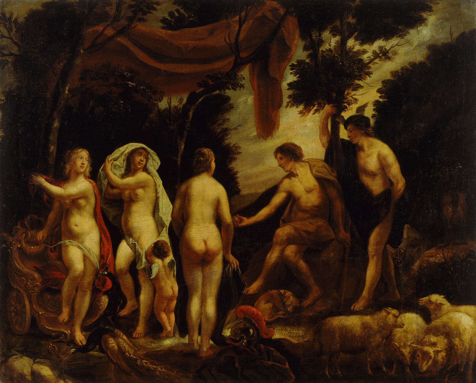 Como decíamos anteriormente, todos los dioses fueron invitados a la boda de Peleo y Tetis, excepto Eris. Ésta se presentó de improviso en la boda y dejó sobre la mesa una manzana de oro en la que estaba inscrita la palabra kallisti (‘para la más hermosa’). La manzana fue reclamada por Hera, Atenea y Afrodita. Zeus resolvió el asunto nombrando árbitro a Paris, el príncipe de Troya, que había sido criado como pastor a raíz de una profecía, según la cual sería el causante de la caída de Troya.