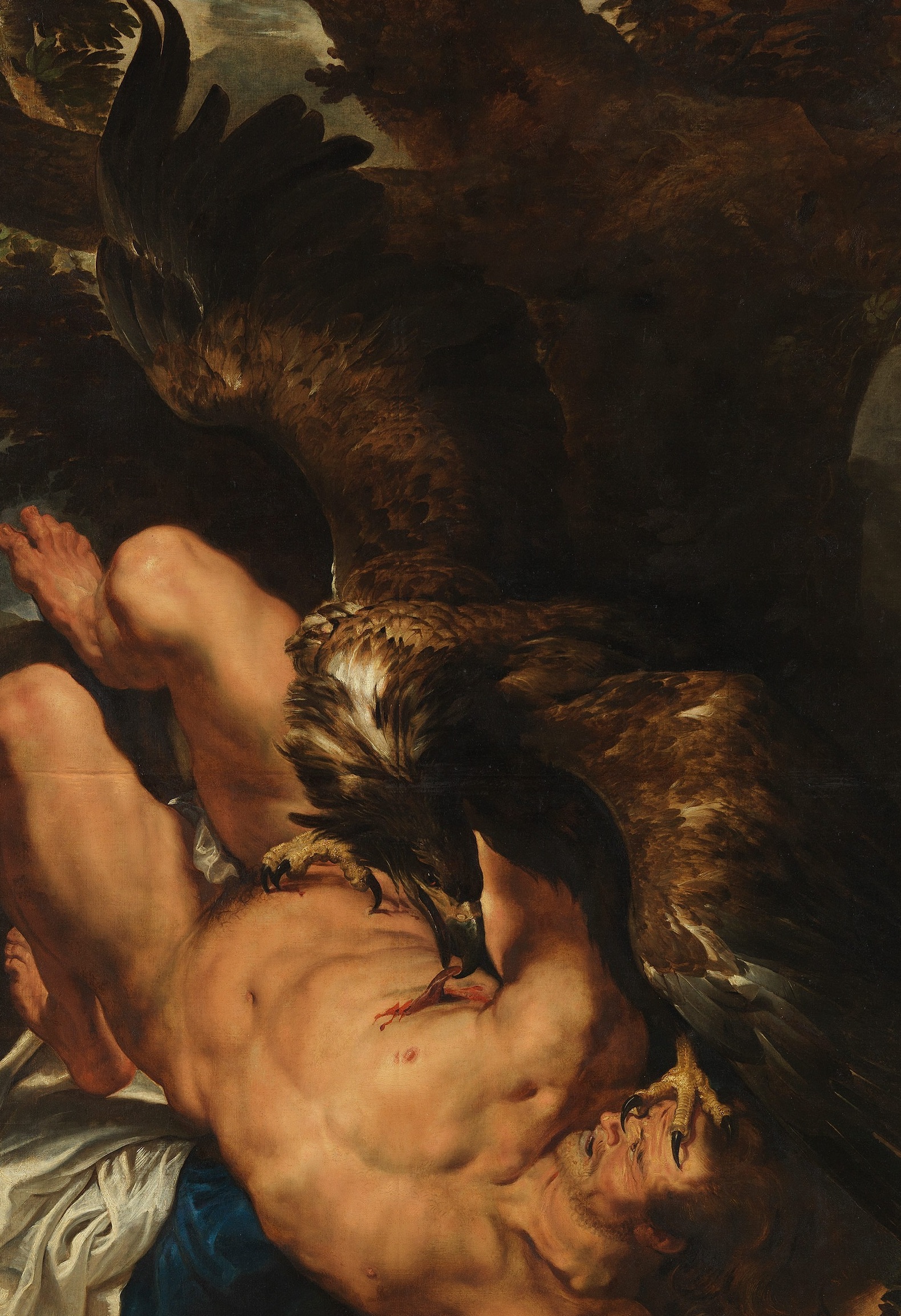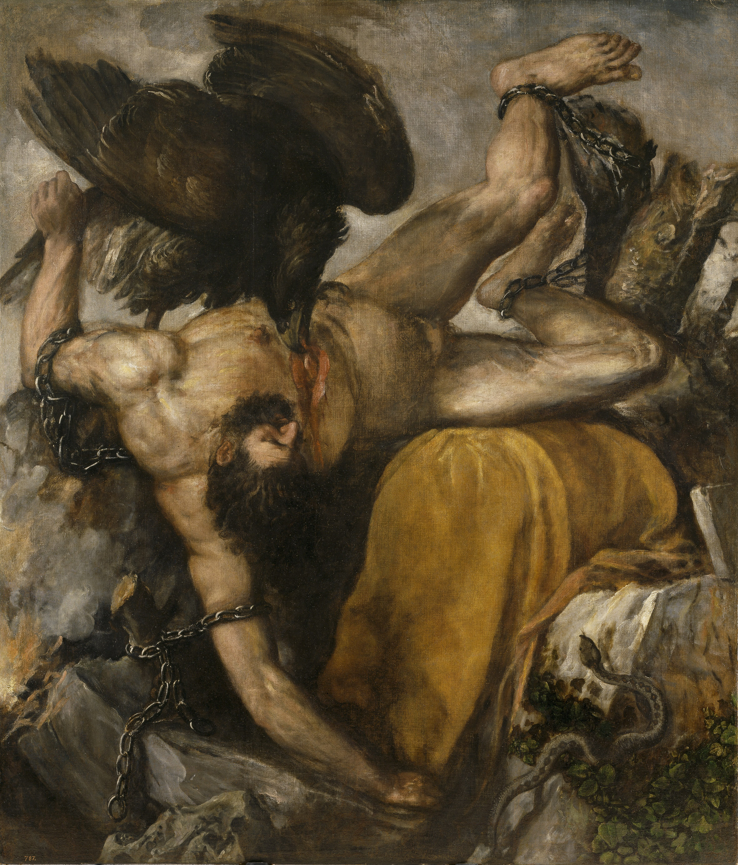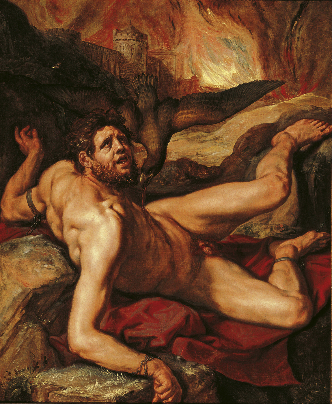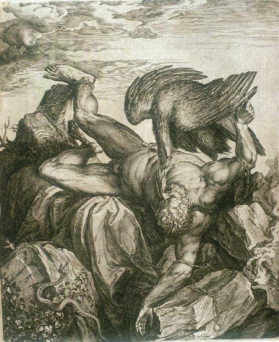 Actitud tan provocadora tuvo un castigo brutal: mediante la ayuda de Hefesto, que se hizo acompañar en esta ocasión por la violencia (Bía) y la Fuerza (Krátos), Zeus “ató a Prometeo, el abundante en recursos, con irrompibles ligaduras y dolorosas cadenas…, y lanzó sobre él su áquila de amplias alas: ésta le comía el hígado inmortal, que durante la noche crecía en la misma proporción” (Teogonía 522-525). Y así permaneció el hijo de Jápeto varios siglos atado a una columna o roca del Caúcaso hasta que, pasando por allí Heracles (Hércules), se apiadó de él, lanzó flechas contra el águila y liberó al prisionero de sus ligaduras.