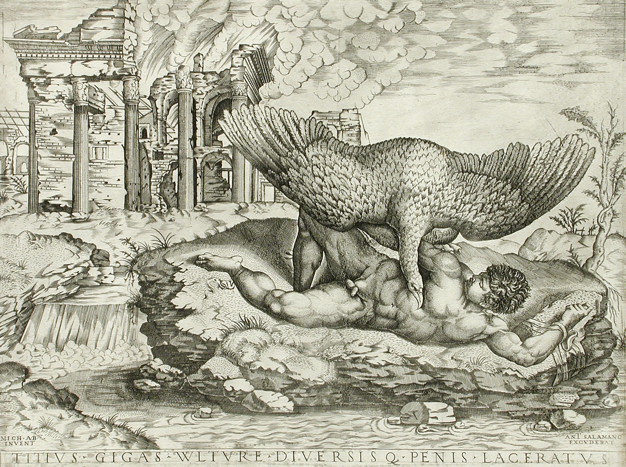 Fue un hijo ilegítimo de Zeus (Júpiter), y que fue ocultado por éste, antes de nacer, en el seno de Gea (la Tierra), lo que le dio el aspecto de un terrible gigante. Hera (Juno) inspiró a este ser un irrefrenable deseo de violar a Leto (Latona), de modo que tuvieron que intervenir los hijos de ésta –Apolo y Artemis- para darle muerte. Una vez muerto Ticio quedó tendido en el suelo del Hades, y unas serpientes, buitres o águilas devoran su hígado, que renace con las fases de la luna.