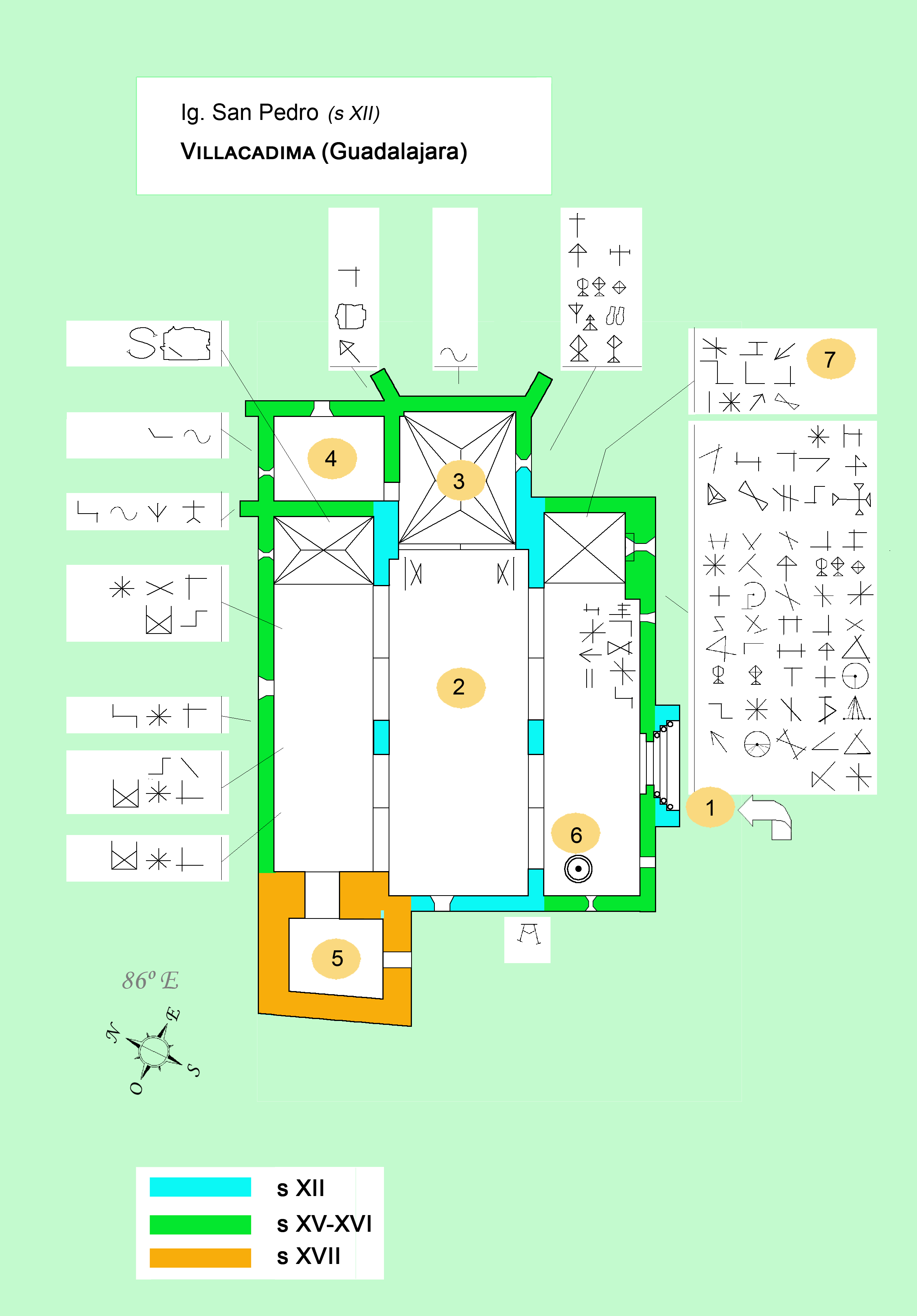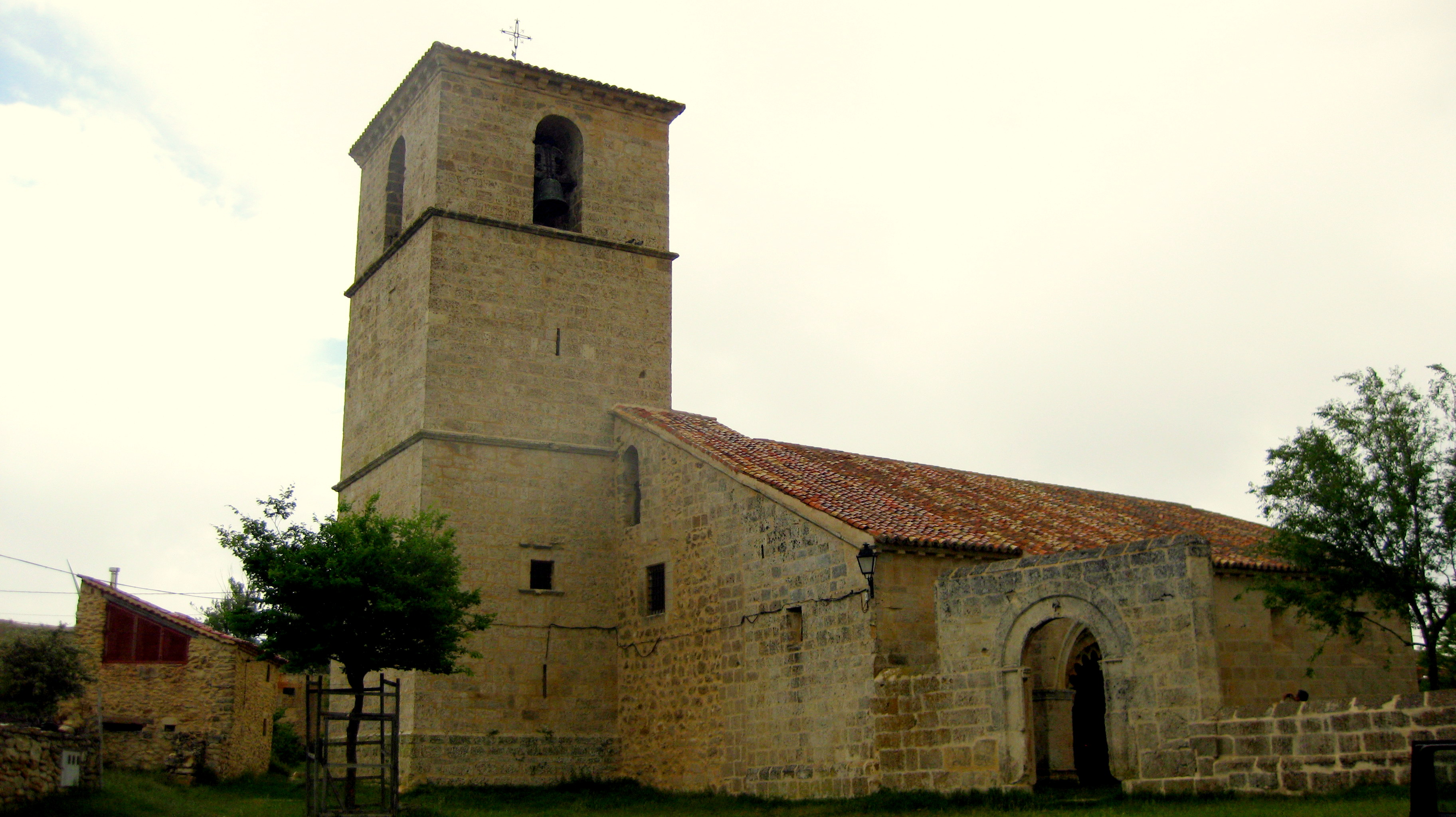 La iglesia parroquial de San Pedro en Villacadima, magníficamente restaurada, se yergue aislada en un extremo del pueblo dando su fachada principal al antiguo cementerio, recinto rodeado de barbacana (estructura defensiva medieval). Es un excelente ejemplo del románico rural que estamos visitando por el norte de la provincia de Guadalajara, en las estribaciones sur de la Sierra de Pela, con intervención de las manos mudéjares; Fue construido entre los siglo XII y XIII en estilo románico sufriendo importantes reformas en los siglos XV, XVI y XVII en estilo renacentista, que la convirtieron en una iglesia de tres naves y cabecera de tres ábsides. Originalmente la iglesia constaba de una única nave, ábside y espadaña románica, hoy visible formando parte del muro, sustituida por la actual torre campanario. En el muro de mediodía se abre la portada a semejanza con las dos de la iglesia de Campisábalos. Esta portada nos sugiere, por una parte, la intervención directa de los artífices mudéjares en ellas, y por otra, en que fueron construidas por las mismas personas y en la misma época (ver símbolos de los maestros canteros).