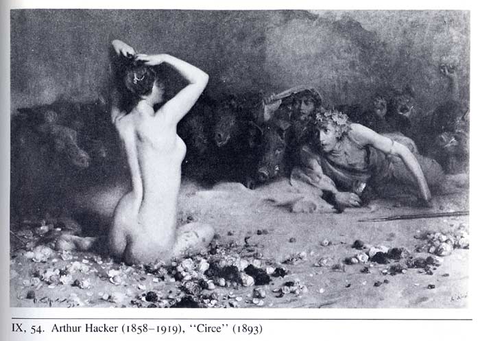 De un artista inglés Arthur Hacker existe un lienzo que lleva por título Circe (1893), en la que esta aparece como una voluptuosa modelo de la época adornándose el cabello con las rosas esparcidas que hay a su alrededor, flores emblemáticas de Venus. En círculo, alrededor de ella, y mirándola con estúpida mansedumbre, aparecen los compañeros de Ulises en varias etapas de transformación en perfectos cerdos. Esta obra, como otras del mismo tipo, sería entendida, o se fingiría entender, como de advertencia y admonición.