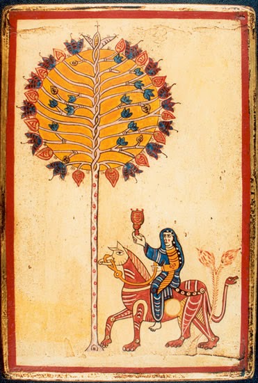 La imagen emblemática del “Beato de Gerona” es “La mujer sobre la bestia roja”. Lleva en la mano el cáliz de sus abominaciones, que levanta triunfante sobre la cabeza. Cabalga sobre una bestia roja, una especie de caballo con pico de grifo, garras de león y cola rematada en cabeza de serpiente. Aparece también un espléndido árbol de copa redonda, que recuerda modelos musulmanes.