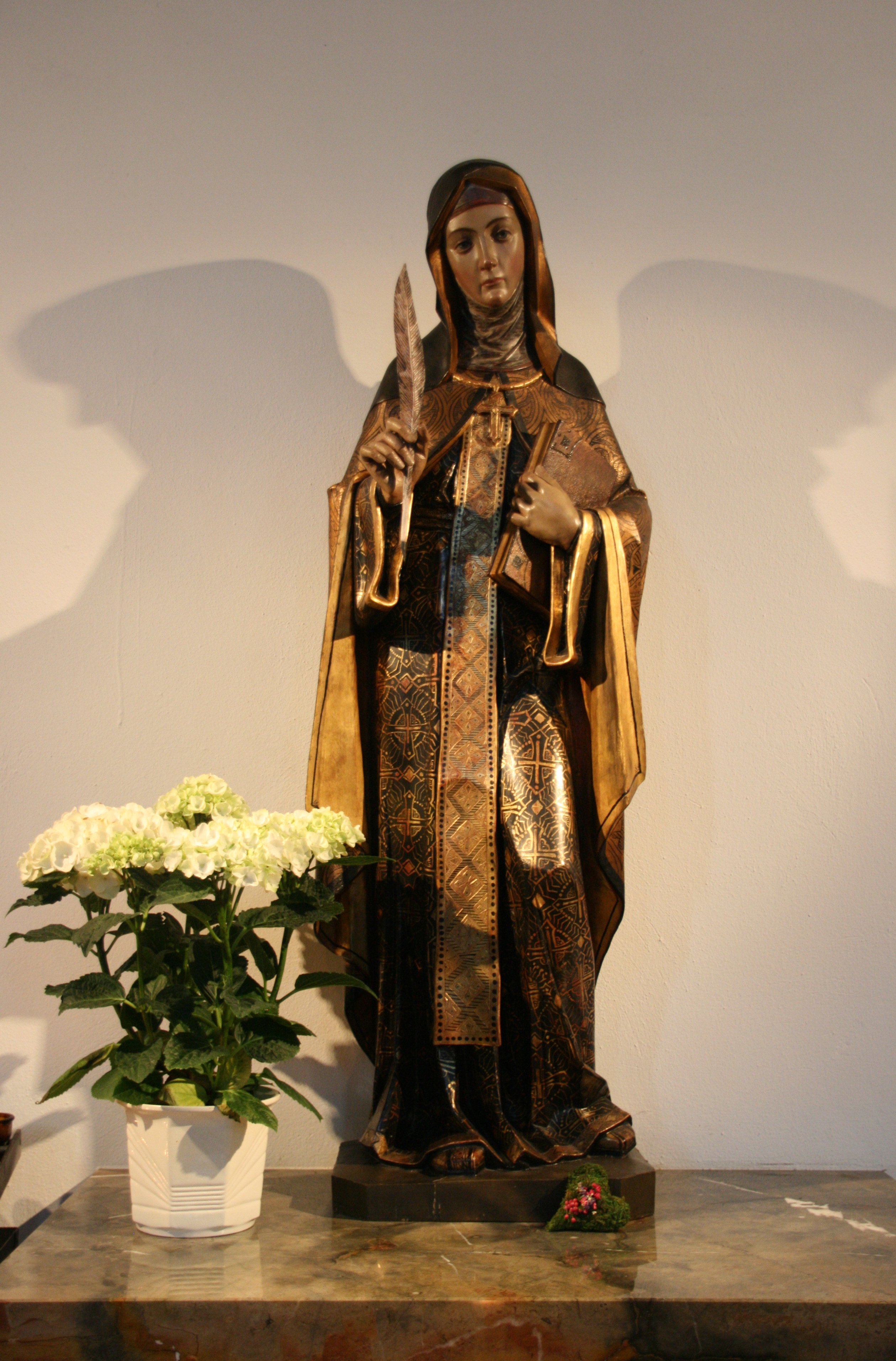 Escultura que representa a Santa Hildegarda, en la iglesia parroquial que lleva su nombre, en Eibingen (Alemania). De artista desconocido, la obra incorpora bellamente los símbolos con que se la identifica: cruz pectoral, pluma, y libro.