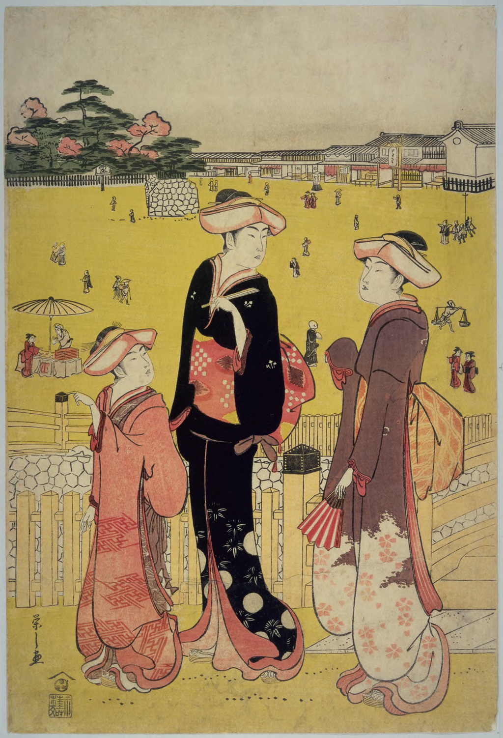 Las mujeres, vestidas con ropas rebosantes de motivos de flores de cerezo, parecen estar dando un paseo. En la esquina inferior izquierda de cada impresión está el nombre del artista, «Eishi». Chōbunsai Eishi (Hosoda Eishi, 1756-1829) nació en una familia de criados directos del shogunato. En su juventud, asistió a Tokugawa Ieharu, el décimo sogún. Aprendió a pintar de la mano de Kanō Michinobu, un pintor del shogunato; se dice que Ieharu le dio su nombre artístico, «Eishi». Eishi comenzó a pintar en estilo ukiyo-e a finales de la década de 1780, cuando era criado del sogún. En 1789, a la edad de 34 años, renunció a su puesto y dedicó el resto de su vida al ukiyo-e. Se destacó por retratar a mujeres hermosas.