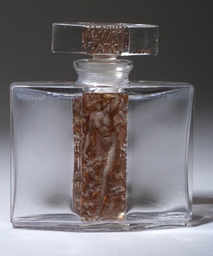 Dánae y “la lluvia dorada”, no podría ser mejor reclamo para el ramo de la perfumería, de hecho existe la marca Dánae; aquí presento esta bella botella de perfume René Lalique Danae, de 8 centímetros de alto por 7 centímetros ancho, de cristal ancho claro con panel central vertical de una figura femenina desnuda y juego tapón: Diseño Lalique LOUVRE PARIS, Circa 1930.