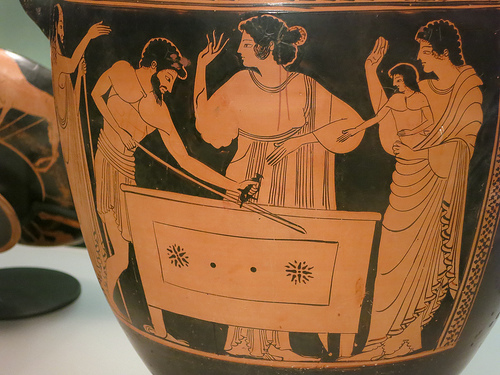 A principios del siglo V a.C. como ya hemos visto en la primera imagen de esta entrada, aparecen en cerámica ateniense sus primeras representaciones.