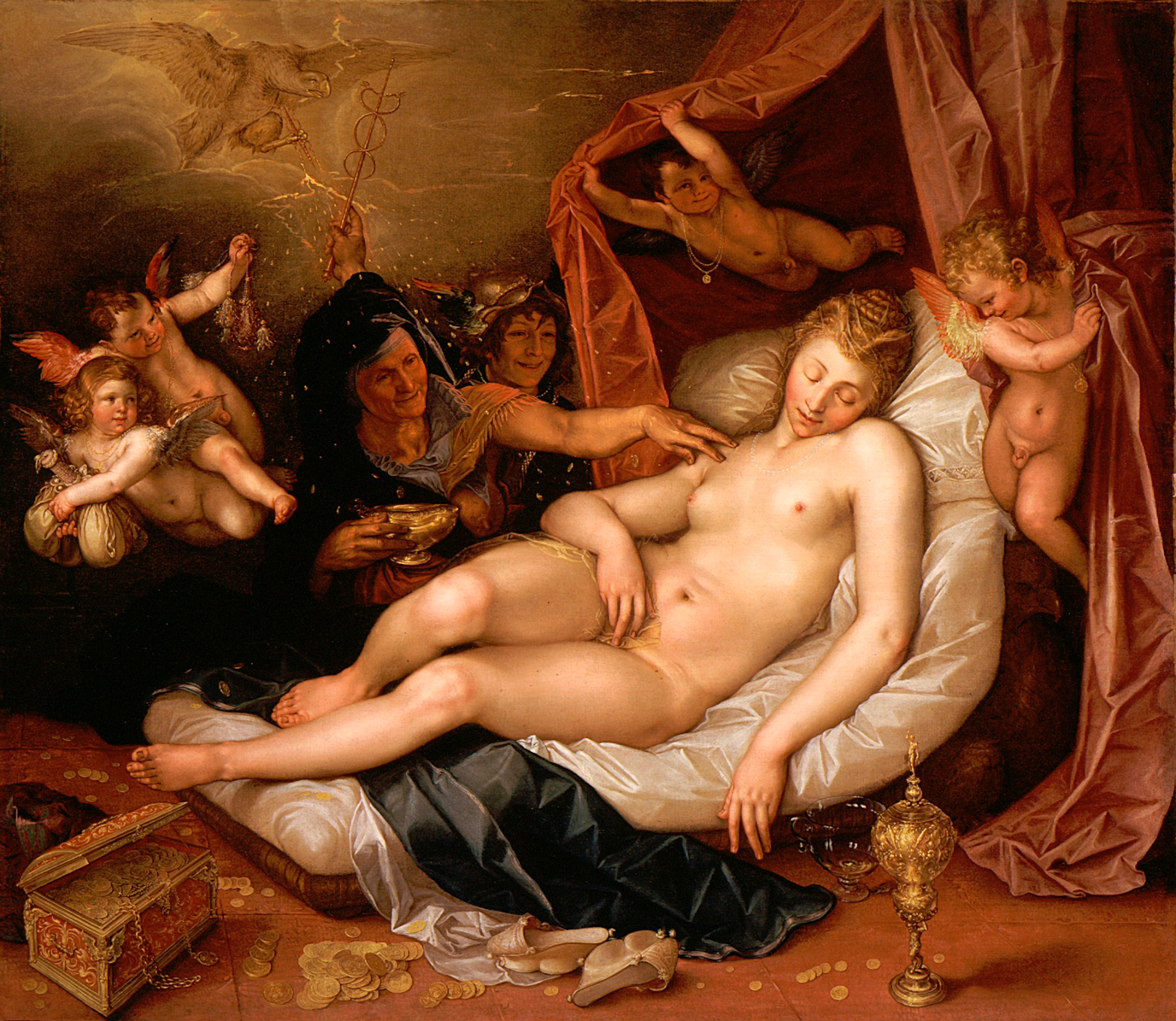 Hendrik Goltzius (1558-1617), Dánae recibiendo Júpiter como una lluvia de oro, (1603); Óleo sobre lienzo, 173,3 x 200 cm. Museo de Arte del Condado de Los Ángeles.