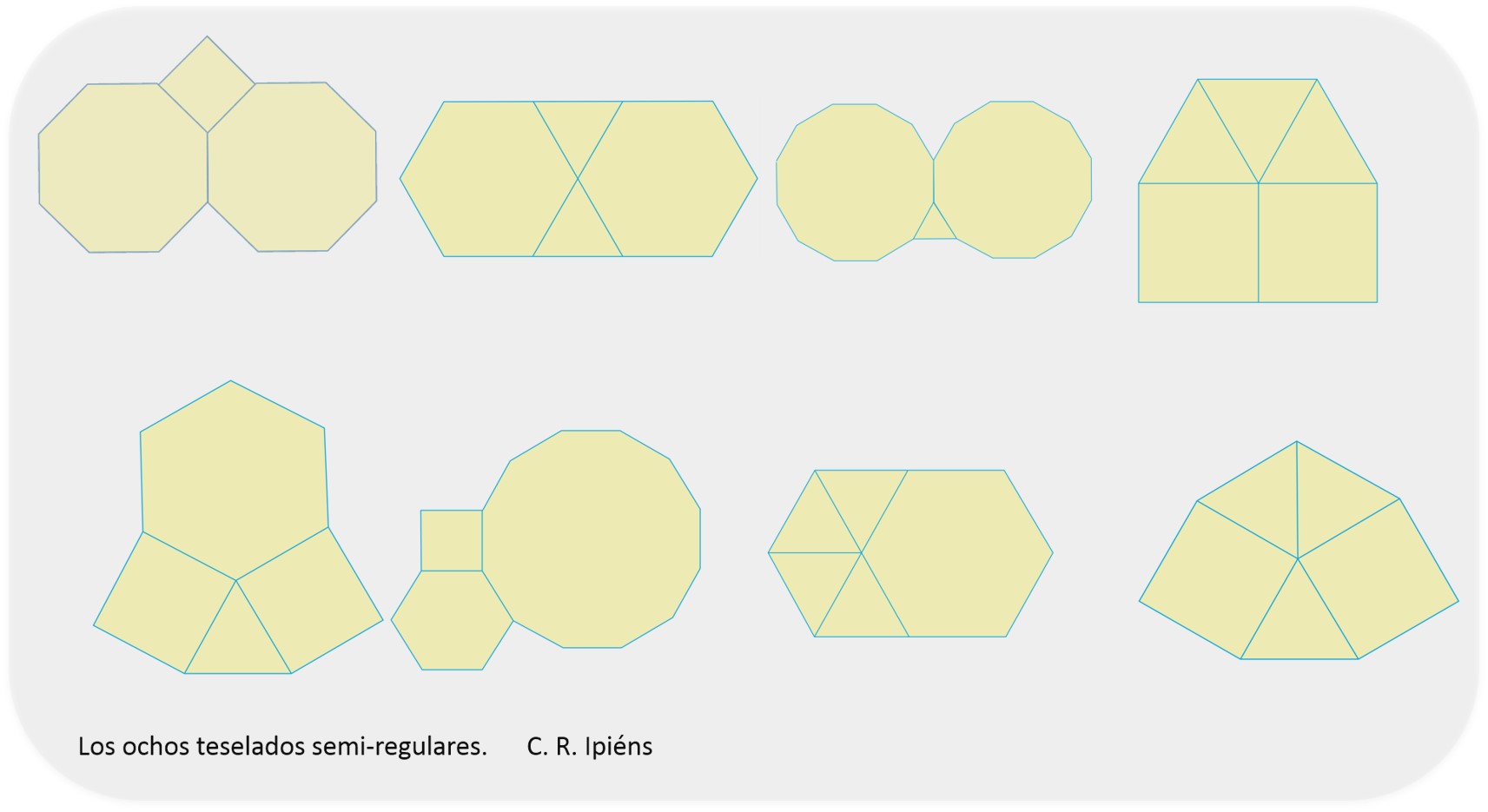 Cuando sólo usamos los tres teselados regulares y los 8 teselados semi-regulares. Existen 14 teselados demi-regulares. Algunos de ellos son: