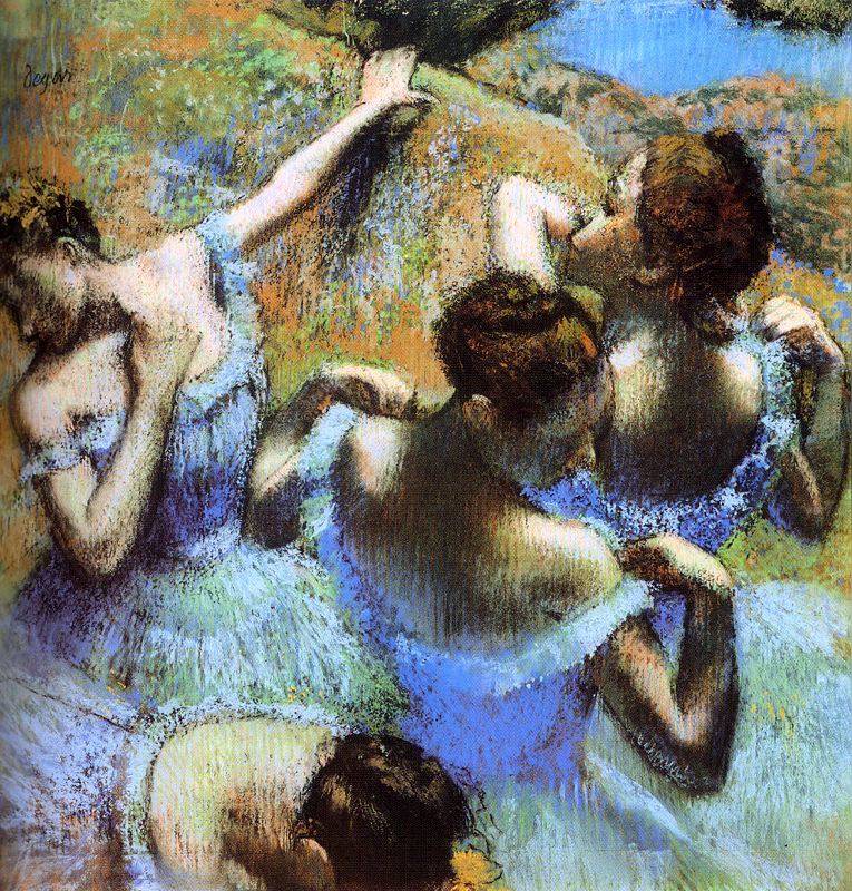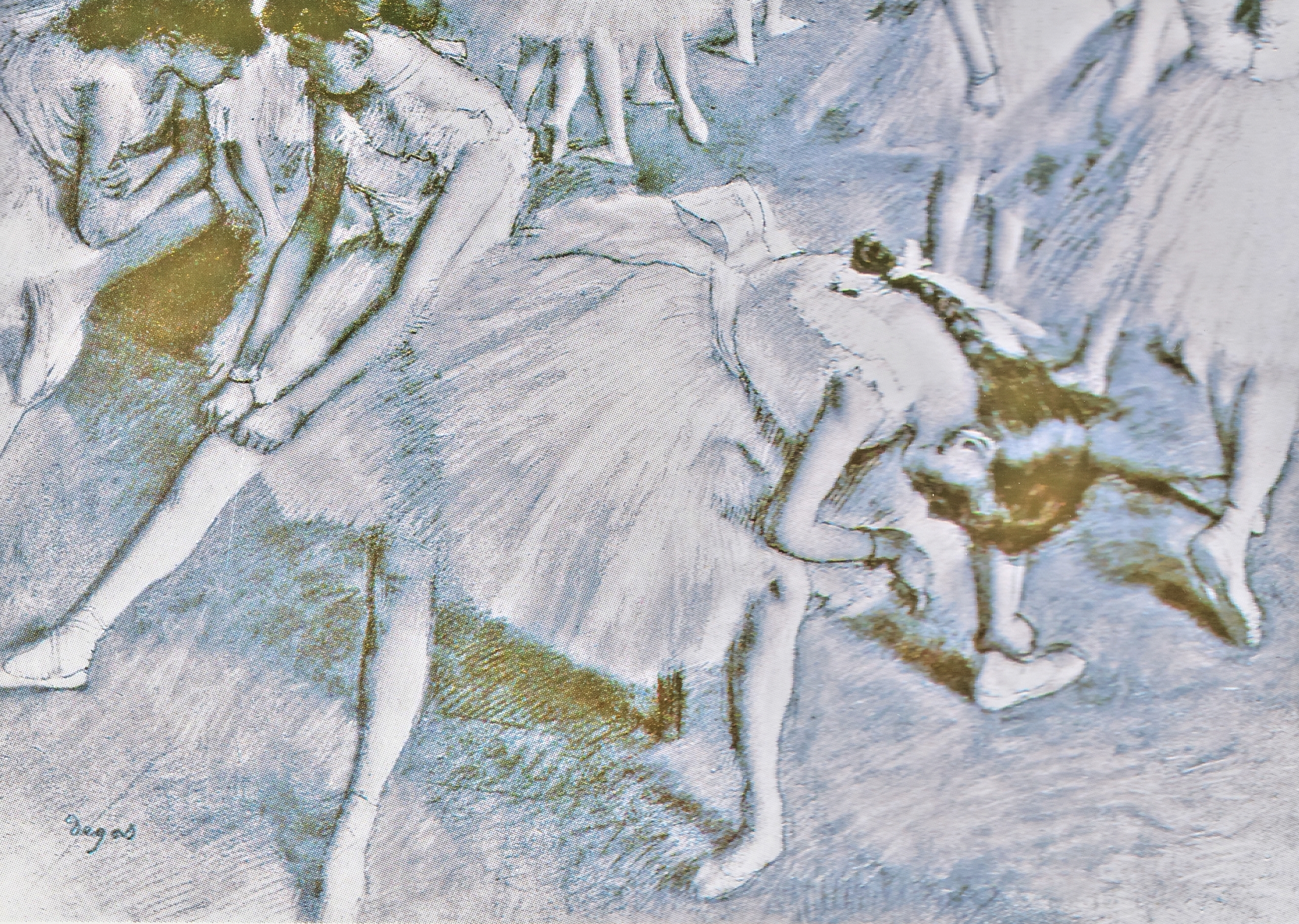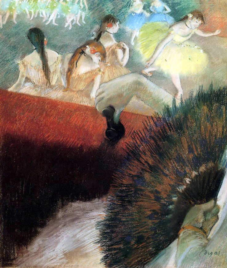 Amante de la ópera y del ballet, era un asiduo del Teatro de la Ópera de París, donde tenía acceso a los ensayos, clases, etc. Observando los ensayos y las clases de ballet, Degas tuvo ocasión de ver cuerpos en todas las actitudes y desde todos los ángulos. Mirando el escenario desde arriba, vería a las muchachas danzar, o descansar, y estudiaría los escorzos difíciles y los efectos de la luz de las candilejas en el modelado de la forma humana. La ilustración siguiente muestra uno de los apuntes al pastel de Degas. La composición acaso no resulte muy natural en apariencia. De una de las bailarinas sólo vemos las piernas; de otras, el cuerpo solamente. Una sola figura está vista por completo, y, aun así, en una postura intrincada y difícil de examinar. La vemos desde arriba, con la cabeza hacia adelante y con la mano izquierda sujetándose el tobillo, en un estado de relajamiento. No existe nada anecdótico en los cuadros de Degas; a él no le interesaron las bailarinas porque fueran muchachas bonitas, ni parece que se preocupara por sus estados de ánimo, ya que las observaba con la misma desinteresada objetividad con que contemplaron los impresionistas los paisajes en torno a ellos. Lo que le importaba era el juego de la luz y las sombras sobre las formas humanas, y ver de qué manera podía sugerir el movimiento o el espacio. Demostró al mundo académico que los nuevos principios de los artistas jóvenes, lejos de ser incompatibles con el dibujo perfecto, planteaban nuevos problemas que sólo el más consumado maestro en el dibujo podría resolver.