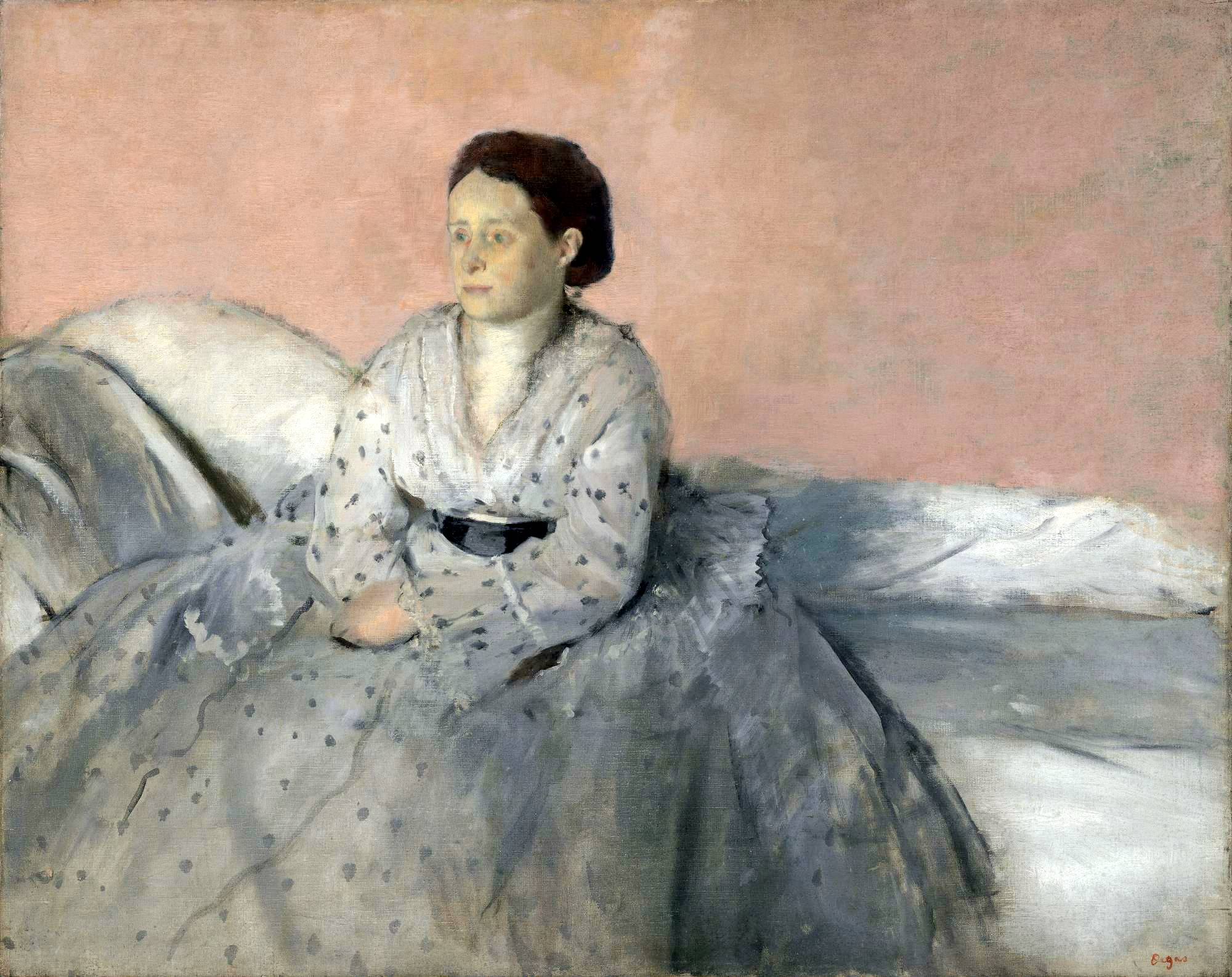 Ante esta mujer que se esconde tras la aparente máscara de los prismáticos, todo aquel que mira se siente a su vez potente y directamente observado. Inquisitorialmente mirado, dado el aumento del instrumento óptico que utiliza la dama. Al primero que devolvió esa mirada directa y frontal fue a Degas. Segura, apoya la mano en el codo y observa, observa. En el otro extremo del espectro situaríamos a Estelle Musson, su cuñada invidente, a quien Degas sigue con la mirada, un poco premonitoriamente (Degas, acabó sus días acompañado de la ceguera) empática, hacia algún lugar vacío, indiferente.
