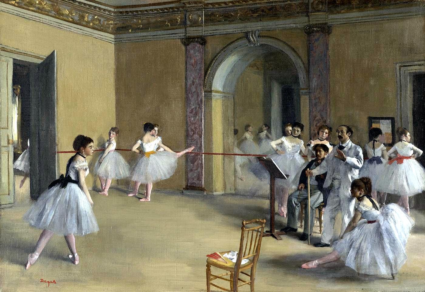En esta obra, muchas de las bailarinas de Degas han perdido su aura. Realizan un trabajo asalariado, un aburrido trabajo mecánico, Las madres deben estar siempre pendientes de que sus hijas no se agoten. La condición social de estas pequeñas esforzadas viene subrayada aquí por la presencia de la madre, como en otro mundo, cerrado además en la lectura del Petit Journal. Nuestra vista choca contra su perfil vulgar y continúa a través de una postura en absoluto delicada. Ella también está cansada de faenar todo el día y no parece importarle demasiado si algo artístico está sucediendo en la sala. Si seguimos por la diagonal que esta figura inicia, dos bailarinas, absortas también, esperan su turno y tapan la silueta negra del profesor, Jules Perrot. Esta mancha negra es tan sólo una mirada que nos envía al otro extremo después de cruzar el inmenso suelo vacío que divide en dos mitades lo que está ocurriendo en la sala. Como suele ocurrir en Degas el suelo unifica a los personajes al mismo tiempo que los separa. Este vacío y amplio plano horizontal está interrumpido en el extremo superior izquierdo por tres pies y una punta. Sólo si levantamos la mirada suponemos otro espacio, confuso esta vez por la presencia de un espejo que nos relanza al exterior, al otro lado del cuadro, por donde hemos entrado en él, donde seguramente, tras nosotros, estén los ventanales que dejen ver Paris. Un barroco juego de equívocos difícilmente re- construible. Si por la derecha juega con sus habituales cortes fragmentarios, como sesgando con fuerza el lugar, en el otro extremo lo expande de manera confusa. Esta vez se ha superado si de jugar con los límites del cuadro se trataba.