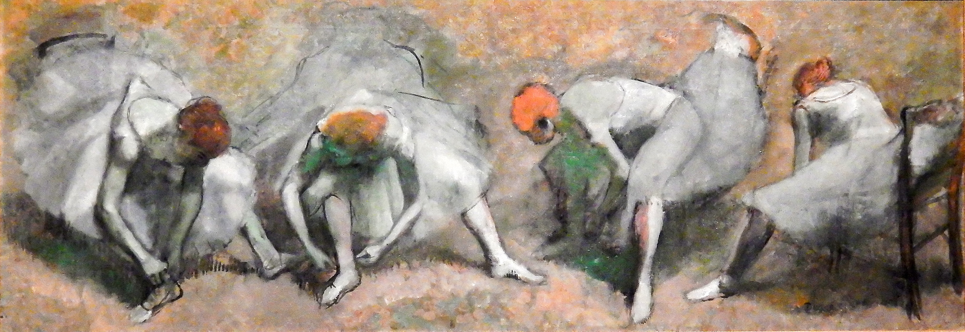 Cuando Degas consigue el libre acceso al Foyer, es cuando comienza su dedicación plena a las bailarinas. En la década de los setenta y ochenta pinta sus bailarinas en el escenario. Por esos mismos años realiza también sus clases y sus exámenes de baile, donde se mezclan las bailarinas con sus madres, Bailarinas en sus toillet, exámenes de baile. Poco a poco aparecen poses aisladas en pasteles, dibujos y esculturas; Bailarinas en la barra, sentadas en una banqueta, atándose las zapatillas, mirándose la planta del pie, en reposo, ensayando el primer tiempo de un arabesque, el segundo, el tercero… Toda esta preocupación por los gestos y las actitudes de las bailarinas culmina en su última época con las series y repetición.