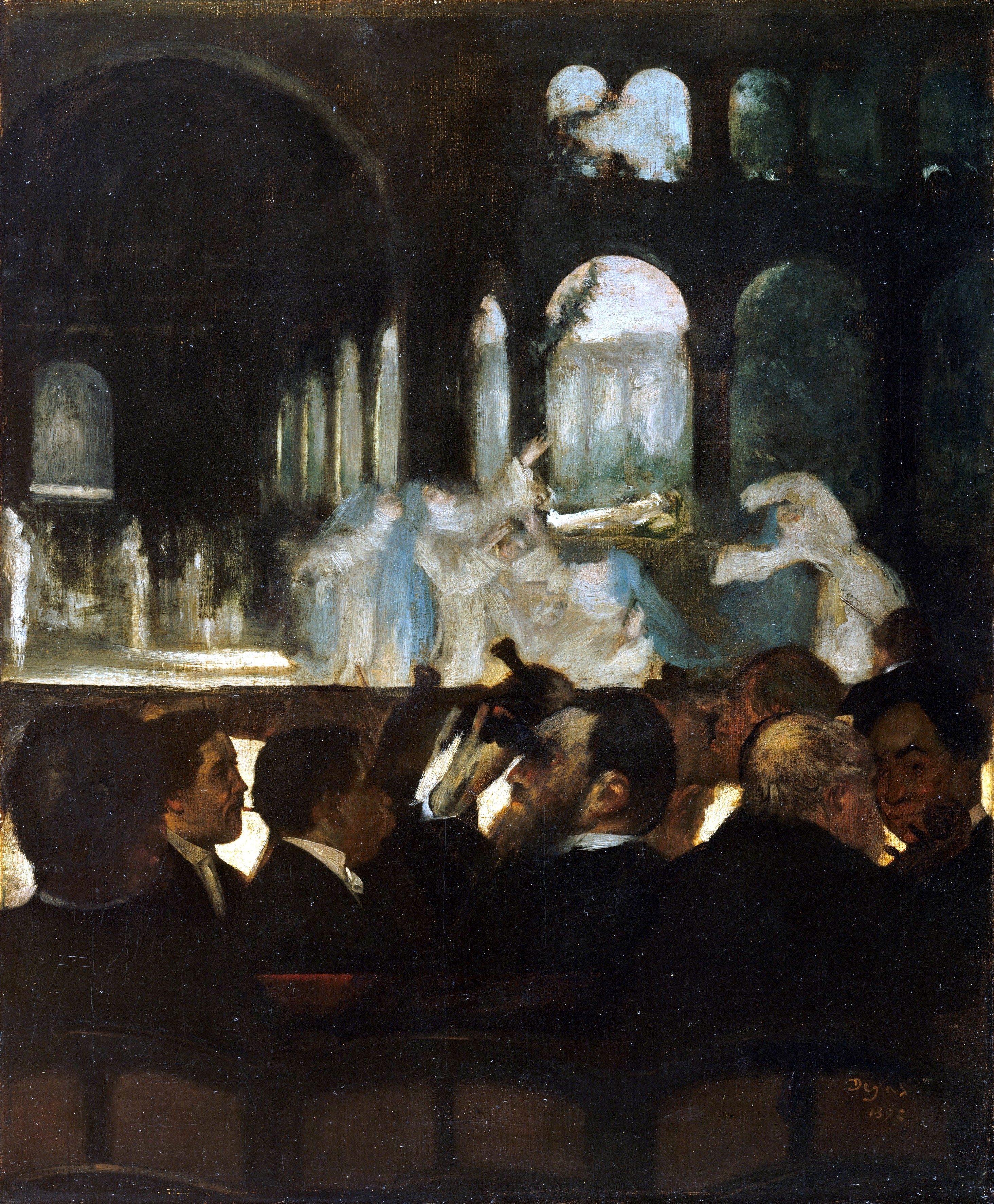 Robert le Diable, de Meyerbeer, fue uno de los espectáculos más representados en la Opera de París, realizándose 758 actuaciones a lo largo del siglo, siendo la última el 28 de agosto de 1893. Su escenografía era de las más sobresalientes al representarse algunas escenas en los claustros de un convento como vemos en la imagen. Degas se sitúa en el patio de butacas y coloca delante de nosotros a varios espectadores para integrarnos en la actuación. Los miembros de la orquesta ocupan la fila inmediata a los hombres que tenemos delante por lo que ocuparíamos la segunda fila. Uno de esos hombres se olvida de la representación para mirar con sus anteojos a los palcos, mientras otro vuelve su cabeza hacia nosotros en actitud de reproche. De esta forma el artista se muestra más preocupado por ofrecernos el ambiente que rodea al espectáculo que la actuación en sí. Las tonalidades negras de los trajes, reforzadas por la oscuridad de la sala, se adueñan de la composición en la que destaca la pincelada rápida sin olvidar el dibujo, características habituales en la obra de Degas.