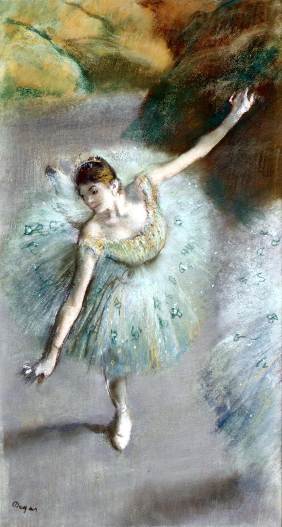 De entre todas las miradas que abarca la obra pictórica de Degas – hombres, retratos, caballos, pasajes de la vida cotidiana…- hay una mirada que puede decirse obsesiva en ella: la mirada a la mujer, que pudiera resumirse en dos amplísimas líneas temáticas, de una parte el desnudo (Las bañistas) y, de otra que será la que presento en esta publicación, las bailarinas.