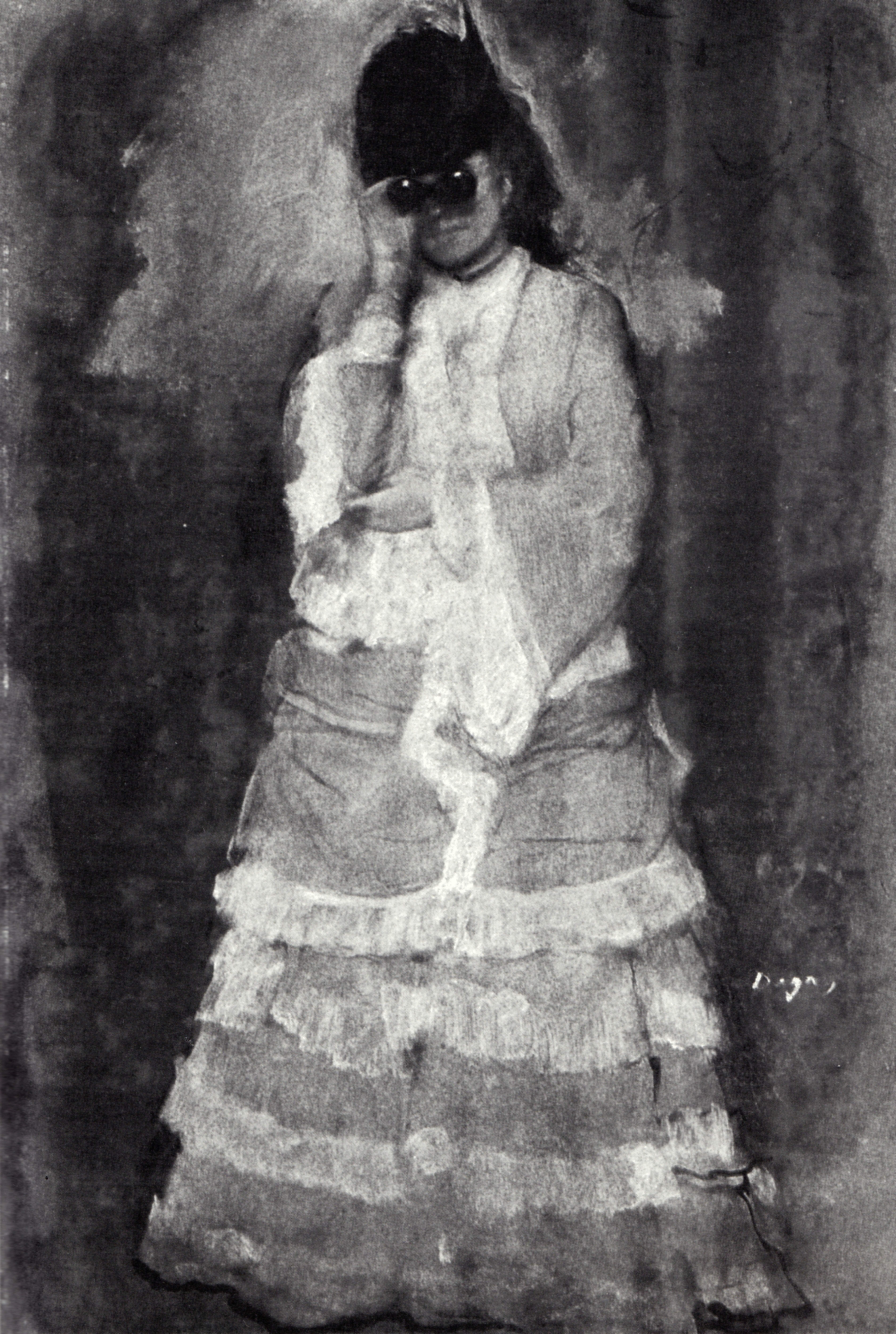 Se suele considerar “Mujer mirando con gemelos” (1875/6), óleo sobre cartón (Siguiente lámina) como un estudio para integrar posteriormente en alguna composición. Degas prestó especial atención al problema de la visión, con lo que bien pudo expresar con esta representación únicamente el acto de mirar.