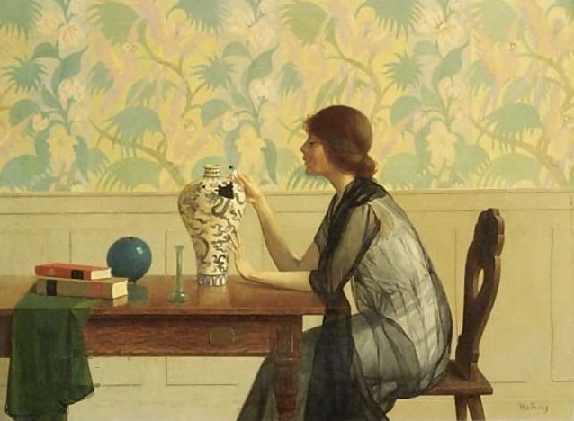 Harry W. Watrous (1857-1940), El paso del verano, 1912. Óleo sobre lienzo, 91,9 x 76,2 cm. Museo Metropolitano de Nueva York. Cuando el Museo Metropolitano adquirió esta pintura, el artista explicó que en el otoño de 1911 se encontró con esta mujer mujer sentada sola en una mesa de un restaurante francés. Watrous le preguntó: «Esperando al príncipe azul?» Su respuesta fue parca y melancólica: «No, ya pasó el verano.» Esta obra alude así a la fugacidad de la juventud y la belleza y la pérdida de oportunidades.