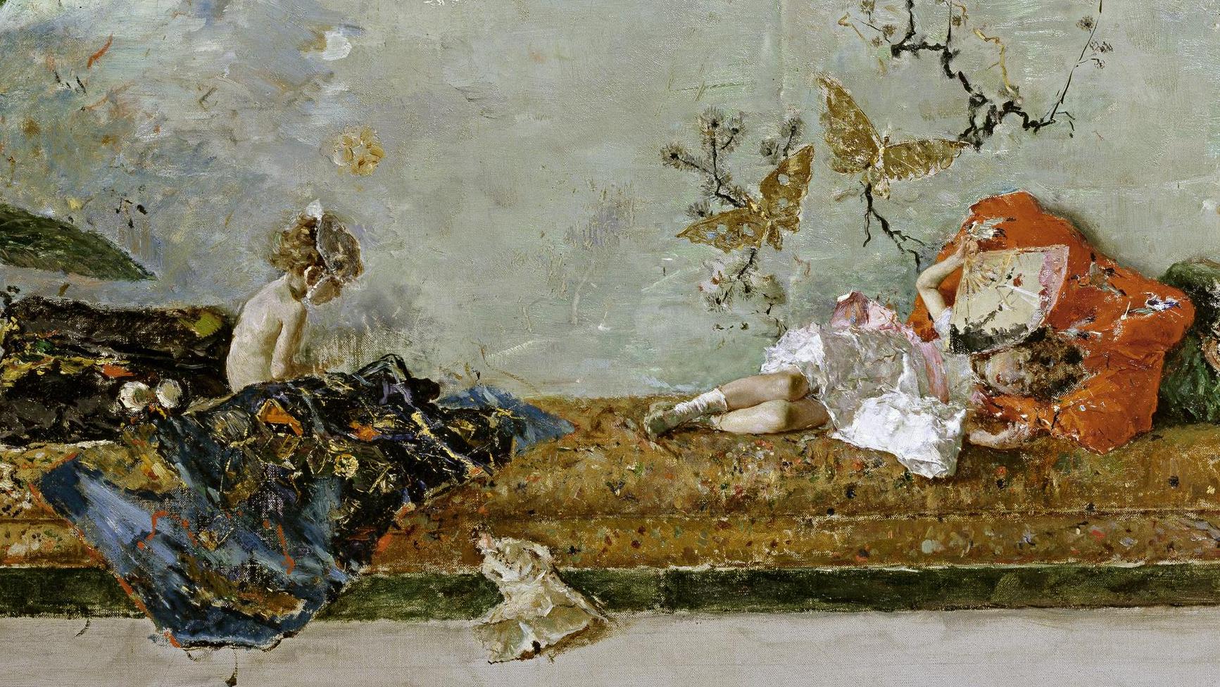 Fortuny comenzó a pintar este cuadro durante su última estancia estival en Portici con la intención de regalárselo a su suegro, el gran maestro Federico de Madrazo. Era por tanto una obra íntima y familiar que iba dirigida de pintor a pintor, lo que explica la esencia exquisita de su calidad como pura pintura en la que Fortuny se expresa con absoluta libertad. El lienzo pone de manifiesto la decisiva influencia que la estética japonesa tuvo en la última madurez de Fortuny. En efecto, el juego de las líneas horizontales y verticales en una composición de gran elegancia por su formato marcadamente apaisado, los diferentes planos lisos de color de los muros y suelo de la estancia y la inclusión de elementos decorativos, como las mariposas y el abanico, testimonian la huella de la estética japonesa en Fortuny, que muestra aquí su soberbio sentido del grafismo en la zona izquierda, de una extraordinaria desenvoltura del pincel, consiguiendo calidades plásticas de una modernidad asombrosa en el muro del fondo, que contrastan con el volumen apurado y preciso con que están modeladas las figuras de los niños, menudas y frágiles, que quedan totalmente envueltas en el despliegue pictórico de su entorno escenográfico.