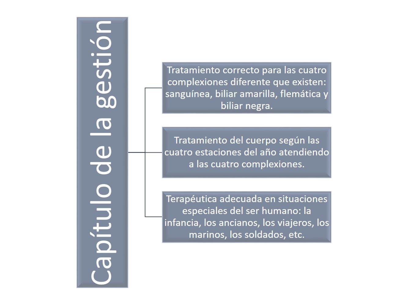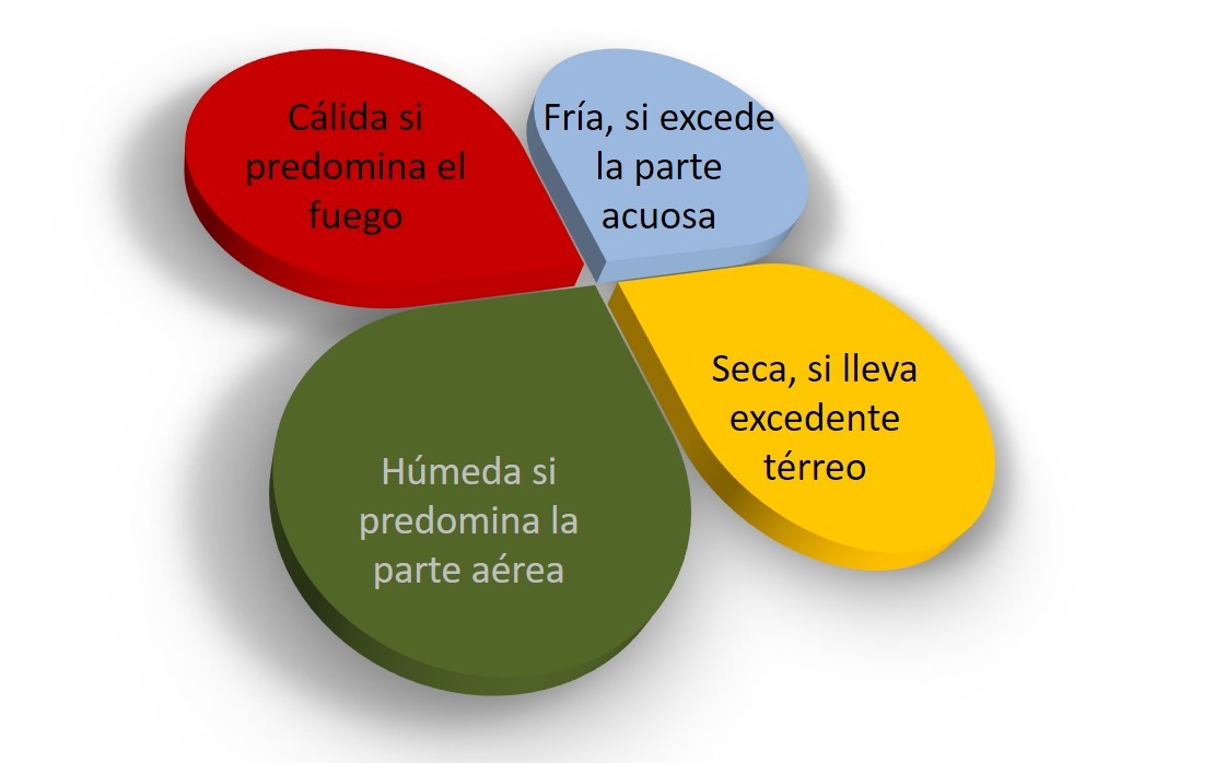 Los cuatro elementos son principios primarios del cuerpo humano a los que se añaden otros principios secundarios que ponen de manifiesto la disposición de su naturaleza; son los humores, cuerpos húmedos y fluidos que transforman el alimento. Según las diversas proporciones de tales elementos primarios y secundarios en el organismo, éste mostrará una complexión dominante a la que habrá de atender el médico juntamente con la edad para concluir sus indicaciones prácticas. Puesto que señala para cada individuo un equilibrio respecto a sí mismo, respecto a la especie, después respecto a la clase y al género. Empero, cualquier desviación producirá alteración del buen estado de salud.