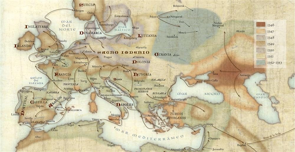 La procedencia de la epidemia: La peste, según el autor árabe Ibn al-Wardi, pudo tener origen en el «País de la Oscuridad», el kanato de la Horda de Oro, en territorio del actual Uzbekistán. Desde los puertos a las zonas interiores, la terrible plaga procedente de Asia se extendió por toda Europa en poco tiempo, ayudada por las pésimas condiciones higiénicas, la mala alimentación y los elementales conocimientos médicos.