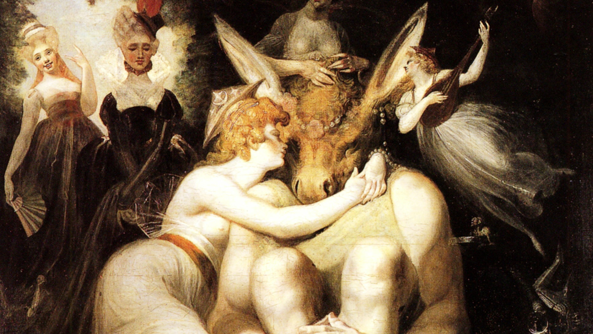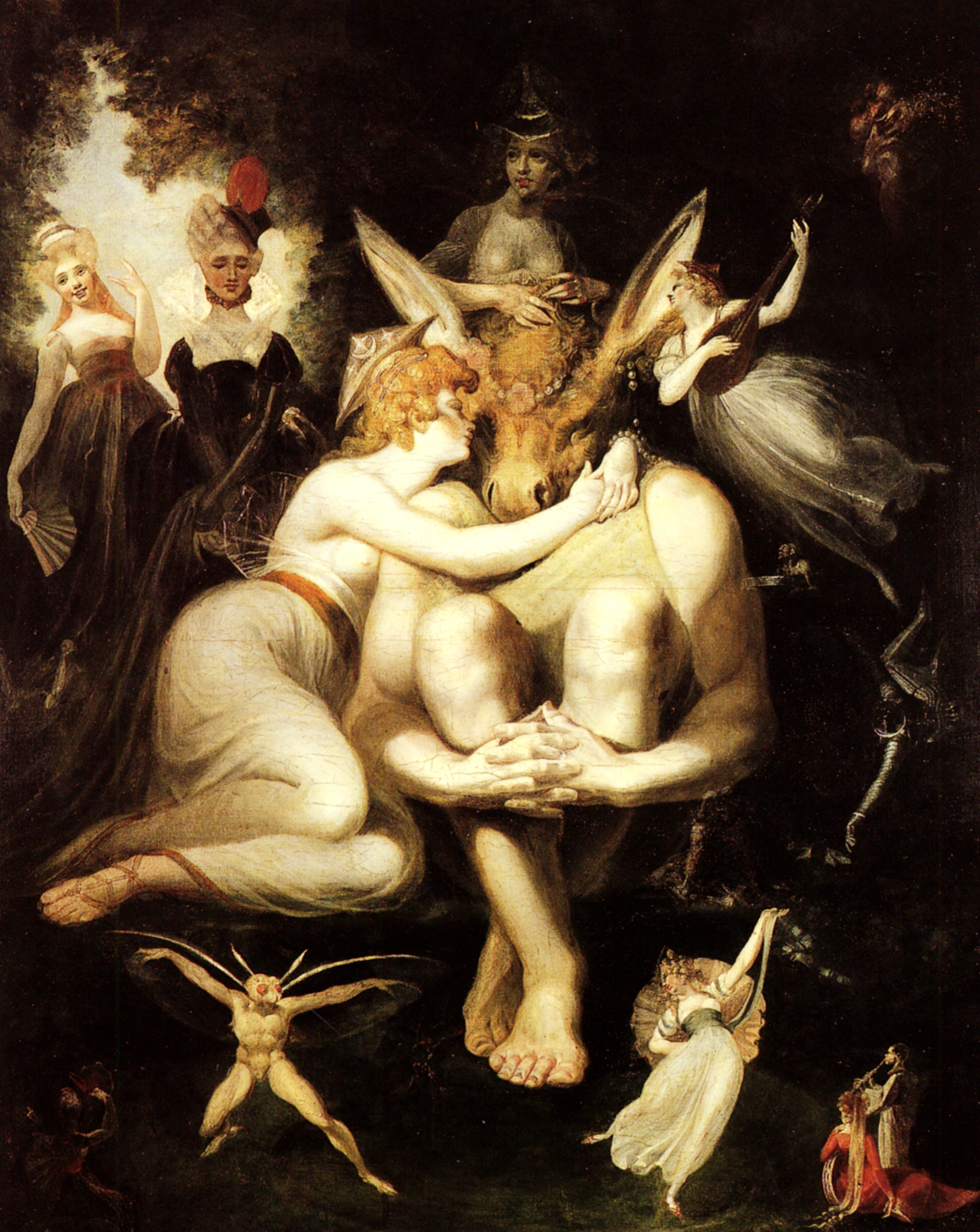 Füssli reprodujo en numerosas ocasiones secuencias de la obra de Shakespeare El sueño de una noche de verano. En este cuadro el pintor plasma el momento en el que el rey Oberón se venga de su esposa Titiana, con la que se había peleado. Por medio de un encantamiento, logró que ella se enamorara del primer hombre que le saliera al paso, y a la víctima, un tejedor, le puso cabeza de asno para que todo el mundo se burlara de su amor. Füssli incrementa la teatralidad de esta absurda situación mediante la incorporación al lienzo de diversos seres imaginarios y con una reproducción muy realista de los personajes principales. El detalle de la siguiente imagen se centra en el amor ciego, como el que brinda Titania al monstruo, que en su parte inferior muestra la apariencia más bien grotesca y ajena del tejedor. Esta contradicción le sirve para hacer hincapié en la parábola de los efectos de los hechizos.