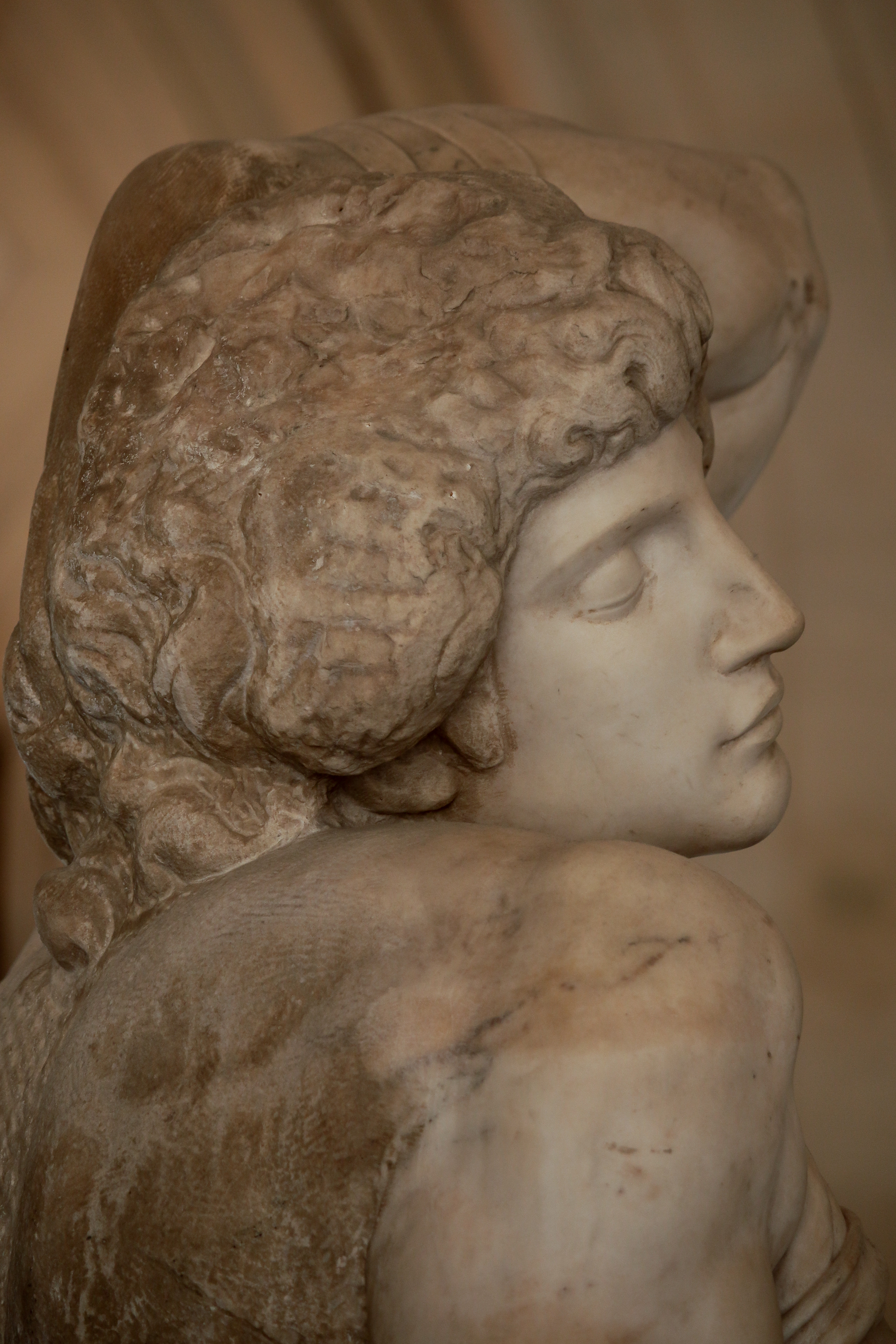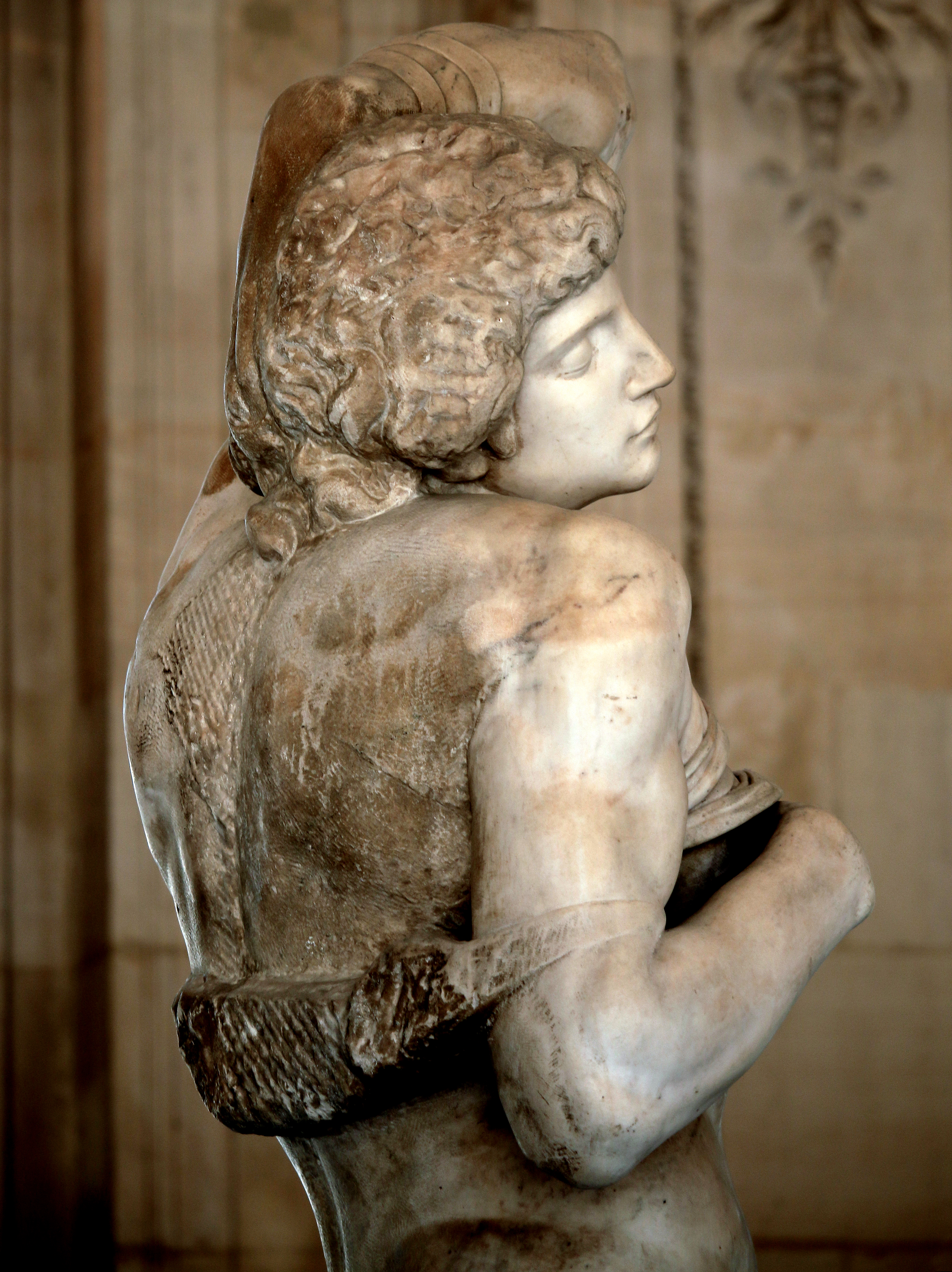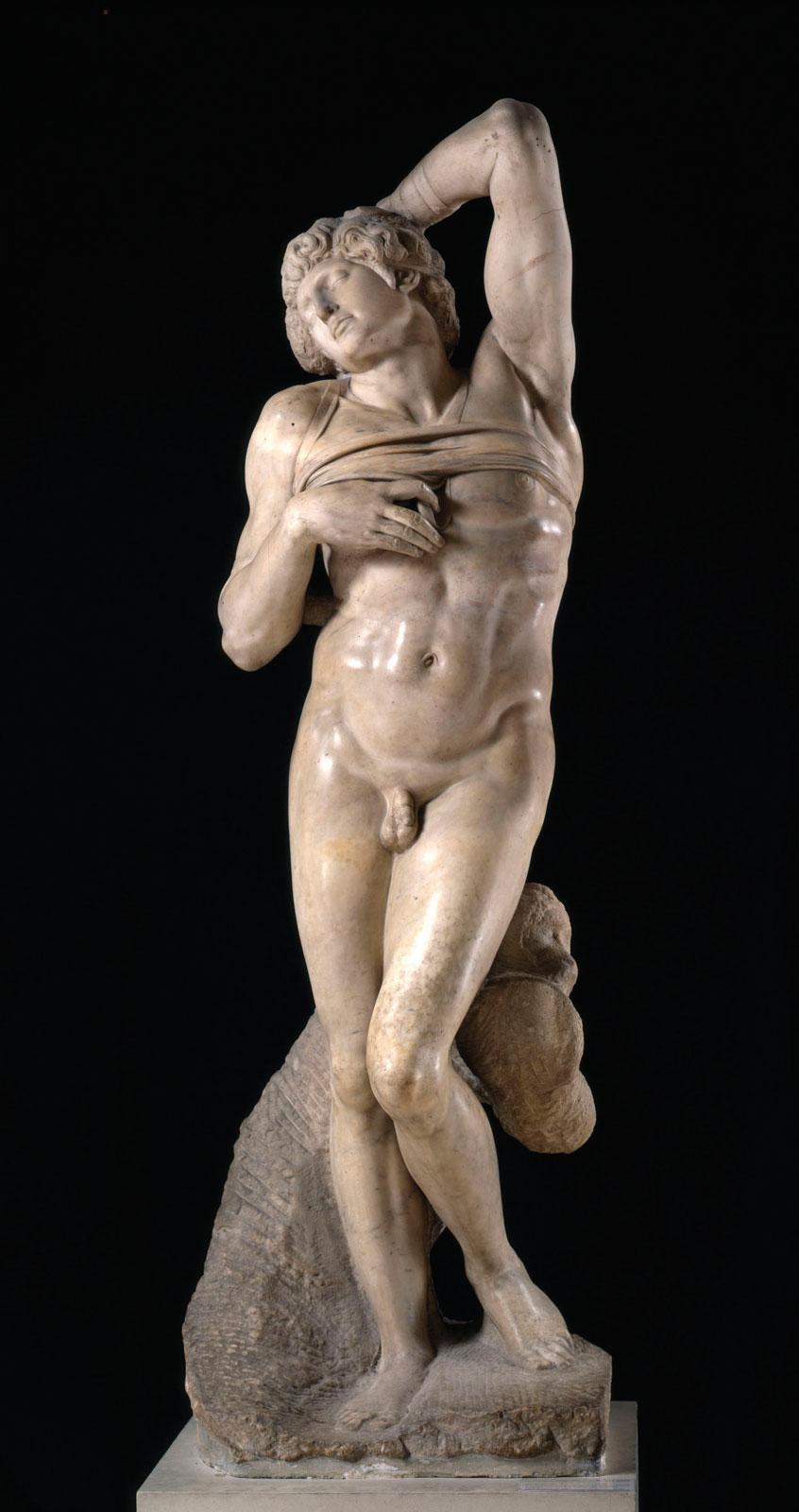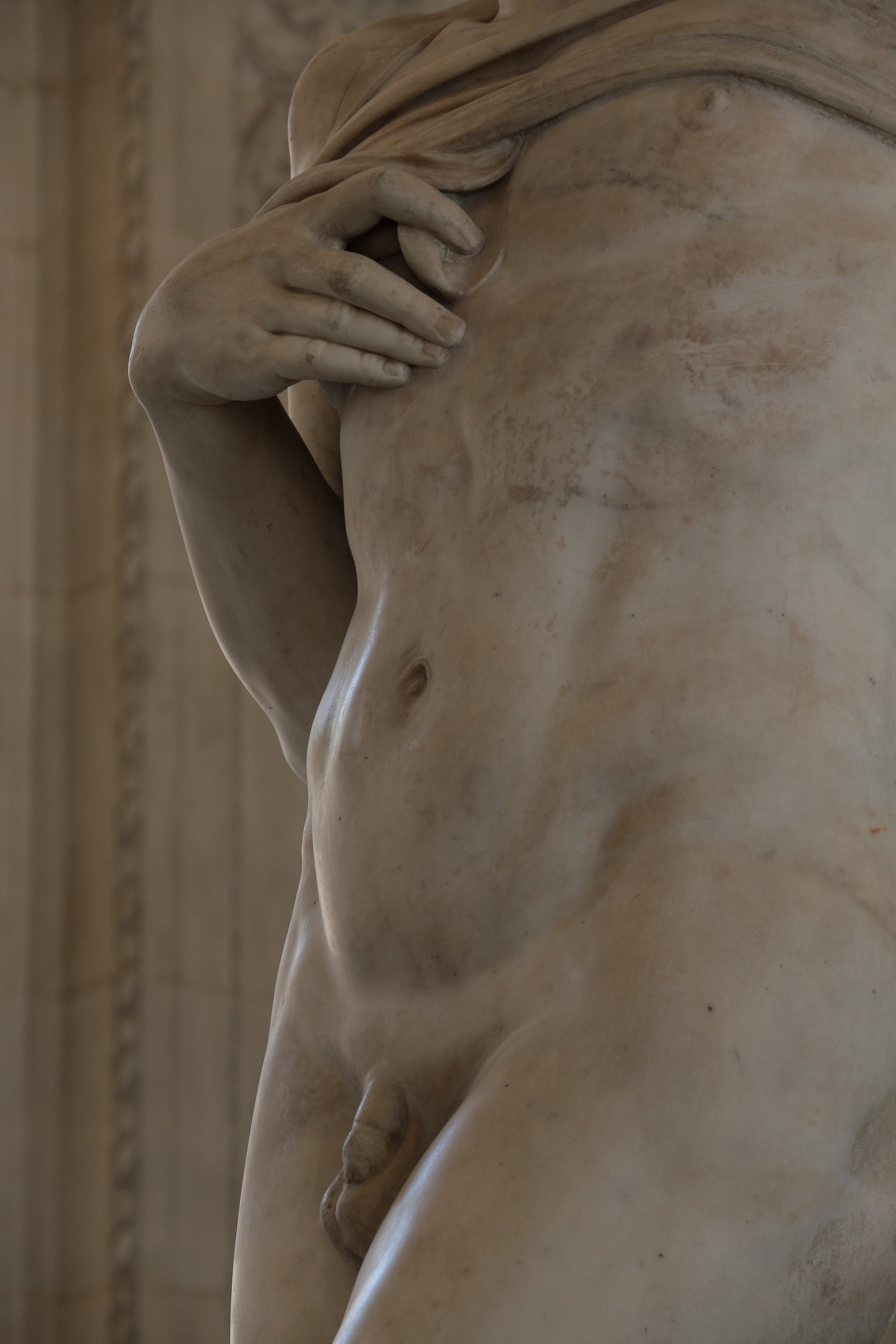 «Las estatuas de Miguel Ángel poseen una inquietante carga erótica. En su obra más conocida, el David, la figura es independiente y el mármol posee un tacto suave con un lustre verosímil, sin embargo, en esta escultura la forma emerge desde la piedra en bruto.