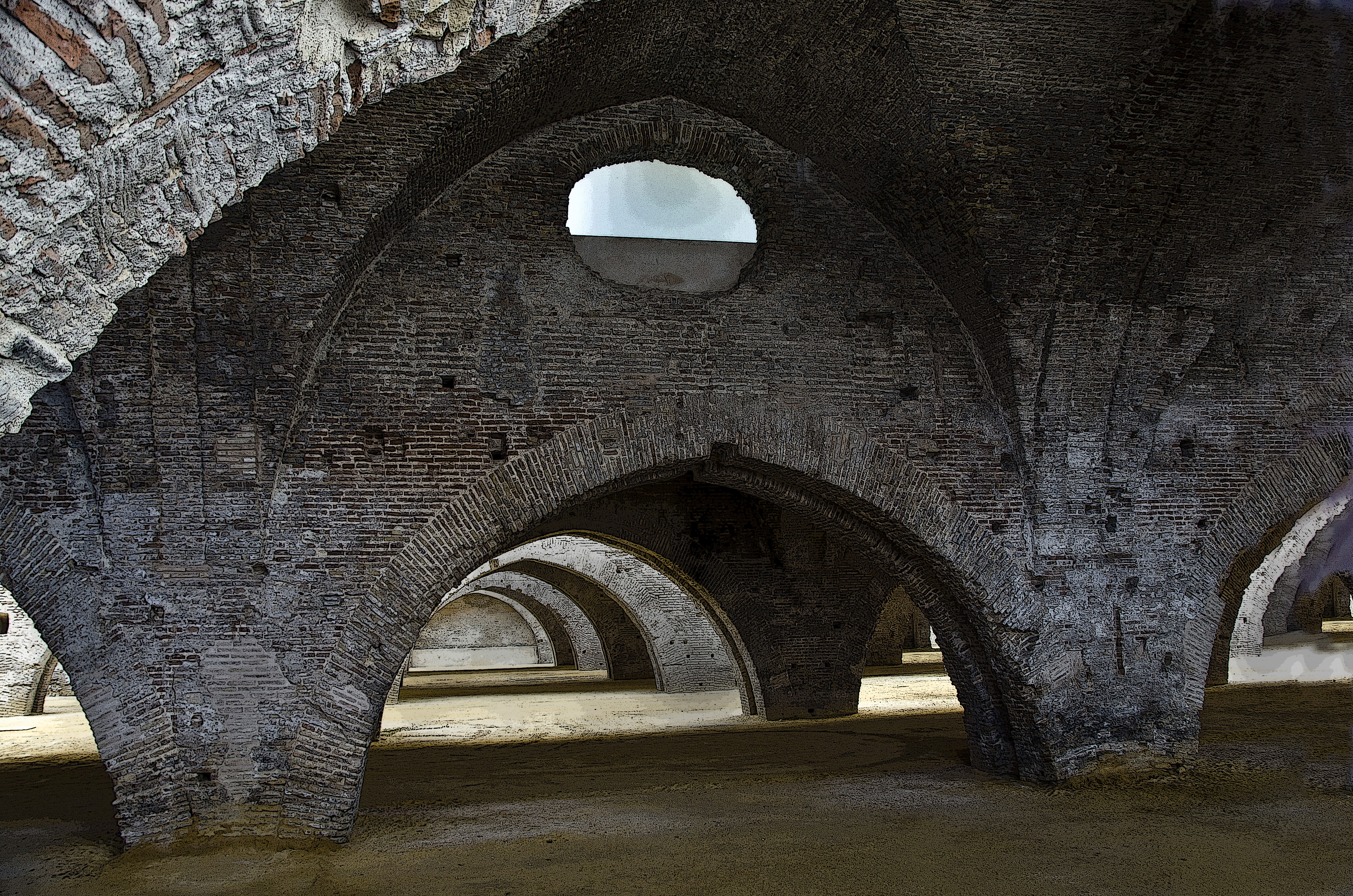 Este primer espacio queda delimitado del siguiente a través de uno de los grandes arcos góticos de ladrillo visto que formaba parte del conjunto estructural de las Atarazanas Reales, quedando visto algún arco más en la pared del fondo.